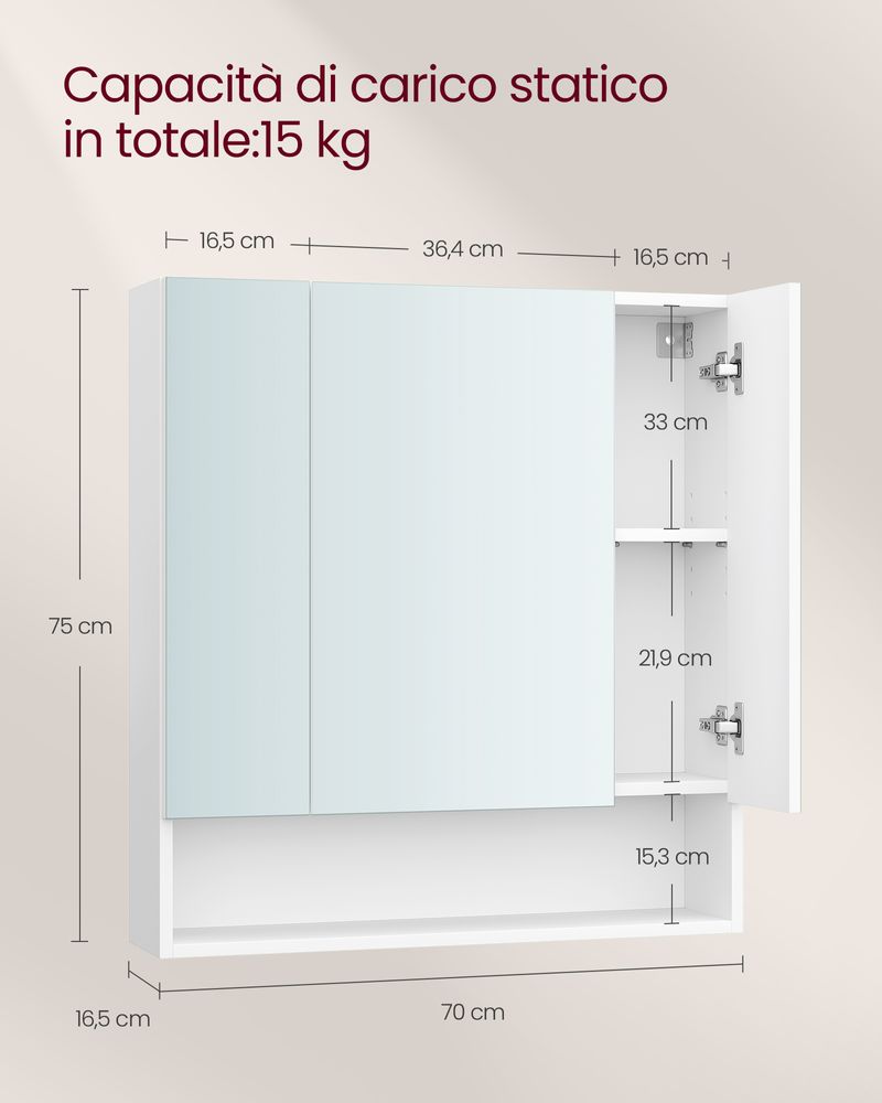 Gli armadietti multiuso freestanding sono realizzati con cura in un bianco elegante e moderno con un design dalle linee minimaliste, per creare mobili eleganti e di design di cui godere. L'indirizzo deve essere dettagliato: via + numero del piano + numero della porta Questo articolo: HOCSOK Armadietto a Specchio Bagno, Pensile con Anta, Mobiletto a Specchio, adatto per Bagno, Bianco, 55 x 17.5 x 60cm 65,99€ 65 , 99 € Ricevilo 14 - 18 apr E ogni anta dell'armadio ha un magnete per evitare che il contenuto dell'armadio cada Ampia gamma di applicazioni: Il mobile alto a colonna ha un aspetto semplice e una bella trama, che può adattarsi a una varietà di stili di decorazione domestica e può essere utilizzato in più stanze della casa, come bagni, camere da letto, soggiorni, ecc HOCSOK Armadietto Bagno a Terra, Mobiletto Autoportante 4 Ante, Mobile Portaoggetti Moderno, adatto per Bagno, Camera da Letto L'armadietto alto per il bagno con anta in vetro smerigliato garantisce la pulizia e consente di vedere gli oggetti contenuti nell'anta, eliminando la fretta e il panico del mattino. La superficie è rivestita con vernice impermeabile ecologica. Design raffinato: Il bordo dello specchio è trattato per essere piatto e liscio, in modo da evitare di graffiare la pelle. Multifunzionale: L'armadio a specchio ha un aspetto semplice e una bella trama, che può adattarsi a una varietà di stili di decorazione domestica. È dotato di un meccanismo antiribaltamento per una maggiore stabilità quando viene fissato alla parete, assicurando che non dondoli o si ribalti Non è adatto solo per il bagno, ma anche per qualsiasi altra stanza della casa, come il soggiorno, l'ingresso o la camera da letto, aiutandovi a rompere la monotonia della stanza Specchiera Bagno HOCSOK Armadietto Bagno A Terra, Mobiletto Autoportante 4 Ante, Mobile Specchio Bagno Facile da montare: Ogni parte del prodotto è numerata e la confezione viene fornita con le istruzioni di montaggio e tutti gli accessori necessari per l'installazione. Nota: l'armadietto a specchio per il bagno è dotato di una barra trasversale sul retro con tre fori, il foro centrale è centrato e la distanza dal foro centrale ai lati è di 19,2 cm. HOCSOK Armadietto Bagno da Terra, Mobiletto da Pavimento, 2 Cassetti e 2 Ante, adatto per Bagno, Camera da Letto Multifunzionale: La finitura laccata bianca, le linee verticali, i cassetti con maniglie tagliate e le ante con maniglie in metallo argentato conferiscono al mobile in legno bianco un aspetto moderno ed elegante. HOCSOK Armadietto a specchio , mobile da bagno con specchio e ripiano regolabile Il design moderno e le linee classiche rendono questo mobile a specchio perfetto per l'arredamento degli interni È adatto per riporre articoli da toeletta quotidiani, prodotti per la cura della pelle, cosmetici e persino medicinali Lo specchio è chiaro e reale, mostra la tua bellezza Si può anche utilizzare come vanity unit per riporre i prodotti per il trucco e la cura della pelle, o tenere qualcosa vicino alla porta per controllare la propria attrezzatura quando si esce