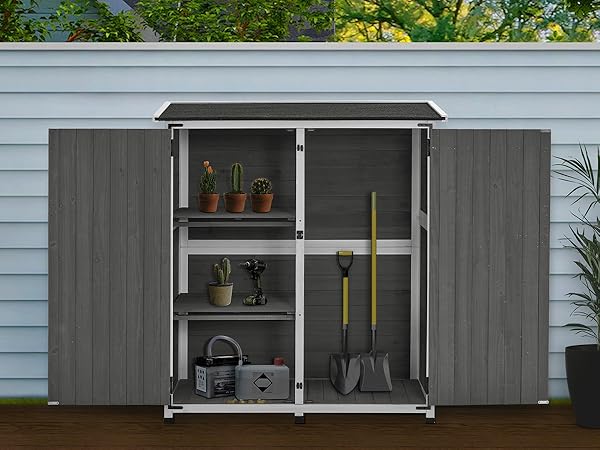 Grazie al telaio in legno , l'armadio da giardino è facile da pulire, resistente e adatto per l'uso quotidiano. Alta stabilità e resistenza: i 4 piedini garantiscono elevata stabilità e stabilità. Sul fondo ci sono speciali chiodi di fissaggio particolarm Squisita configurazione hardware: le maniglie delle porte di alta qualità e il meccanismo di chiusura magnetica assicurano che la porta dell'armadio si chiuda in modo sicuro e impediscono che gli attrezzi vengano persi o rubati. Design del tavolo aperto: la parte superiore dell'armadio è dotata di una superficie di lavoro aperta su cui è possibile riporre gli strumenti utilizzati di frequente o realizzare piccoli progetti di giardino mentre si lavora e aumenta l'efficienza del lavoro. Un'opera d'arte per decorare il tuo giardino: l'armadio per attrezzi dispone di diversi spazi di archiviazione e può ospitare una varietà di attrezzi e attrezzature da giardino adatti a tutti i tipi di lavori di giardinaggio. Inoltre offre uno scaffale per appendere attrezzi da giardino e un banco da lavoro per riporre oggetti a portata di mano, il che è molto comodo! Armadietto Da Esterno Armadio In Legno Da Esterno In Piano In Mobili E Mobili Da Esterno Dimensioni del prodotto: questo armadio per attrezzi misura 141,5 cm di lunghezza, 44 cm di larghezza e 105 cm di altezza e ha due cassetti e due piani.