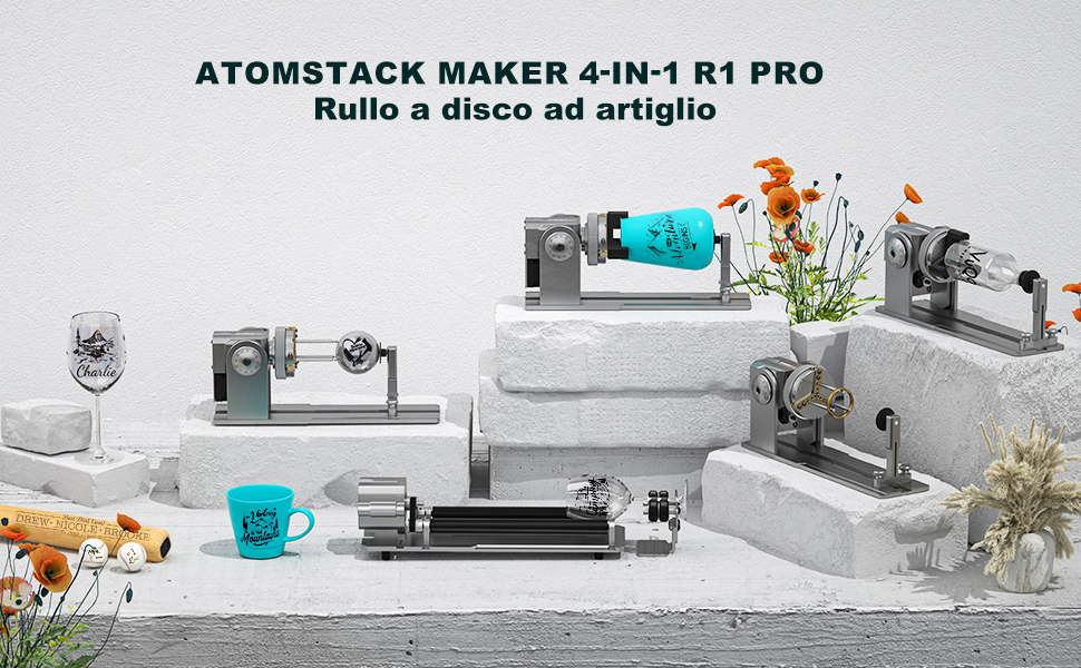 ATOMSTACK R1 PRO Rullo Rotante Laser Disco Da Artiglio Per Incisione Laser, 4 In 1 Rotante Rulli Rotanti Con Asse Y Per Incisione Di Oggetti