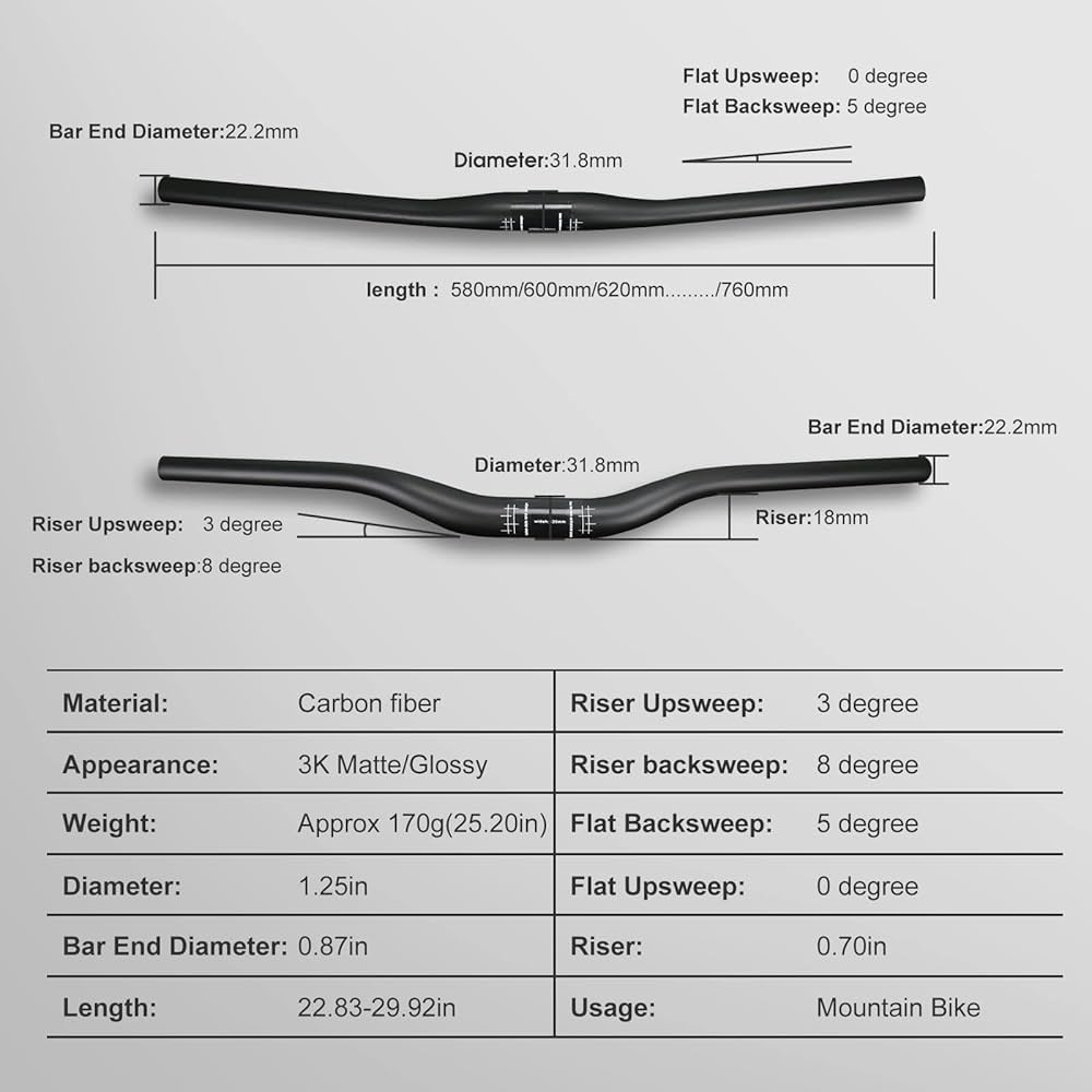 Il manubrio in carbonio rende la pedalata più confortevole 2, manubrio flat carbonio mtb la fibra di carbonio è paragonabile alla lega di alluminio: più leggera, più bella, più luminosa, più forte nella resistenza alla pressione, anti shock, ha un'elasticità adeguata, migliorando la classe della tua bicicletta in pochi minuti. RXL SL attacco manubrio mtb carbonio 25.4 * 640/660/680/700mm manubrio carbonio bici 3K lucido nero manubrio riser 25.4 * 700mm Visita lo Store di RXL SL 4,3 4,3 su 5 stelle 66 voti Manubri Regolabili Attacco Manubrio In Carbonio IN VENDITA! - IT Pesi Palestra Manubri Regolabili Poiché è in carbonio, si consiglia di serrare il corpo per sostenerlo serrando con le mani. 5, manubrio mtb carbonio scegli la taglia: La larghezza del manubrio 25.4 carbon non è realmente correlata alle dimensioni delle ruote, ma dipende dal tuo stile di guida e dal tipo di terreno che normalmente guidi. Il manubrio MTB in fibra di carbonio vibra a velocità più confortevoli rispetto alle barre in lega di alluminio. 4, la coppia migliore del manubrio in carbonio per mtb è di 4 Nm, coppia massima di 5 Nm. 1, diametro del manubrio per mtb carbonio : 25.4 mm; diametro dell'estremità della barra: 22,2 mm; aspetto: 3K lucido/3K opaco, barra piatta: 620/640/660/680mm; 640/660/680/700mm, Backsweep riser: 8°, Upsweep riser: 3°, riser rise: 18 mm, backsweep piatto: 5°, sweep piatto verso l'alto: 0°