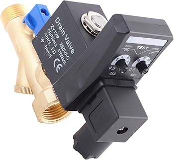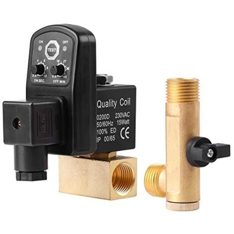Valvola di scarico temporizzata elettronica automatica G1/2 DN15, valvola di scarico separata di per la gestione della condensa del compressore d'aria(230V Il tempo di apertura della valvola è regolabile 0,5 a 10 secondi e il tempo di chiusura è compreso tra 0,5 e 45 minuti Ci auguriamo che tu abbia una buona esperienza di acquisto. Si tratta di una valvola di scarico della condensa affidabile e di per mantenere in funzione in modo ottimale le apparecchiature per il trattamento dell'aria compressa La filettatura G1/2 è ampiamente utilizzata e può adattarsi alla maggior parte dei compressori d'aria Valvola Scarico EVTSCAN Ultima Valvola Di Scarico Automatica, Valvola Di Scarico Temporizzata Elettronica Automatica G1/2 DN15 Per La Gestione Della Condensa Del Compressore D'aria(AC110V Mini Pompa Scarico Condensa Funziona automaticamente e spreca meno aria compressa durante lo scarico della condensa.