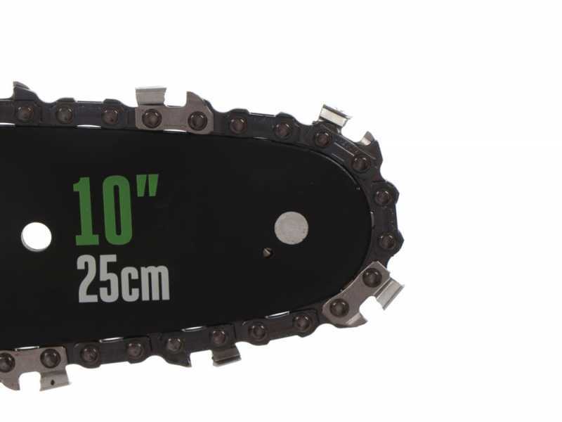 La capacità di taglio del legno è di 20 cm in diametro. Capace di tagliare rami di diametro massimo 20 cm. Montaggio: istruzioni di montaggio e montaggio disponibili in lingua francese realizzate dal nostro team tecnico. Alimentazione: elettrica con batteria. Durata Accessoire élagueuse sur batterie Egopower+ PSA1000E idéale pour l'entretien des arbres fruitiers: Guide chaine de 25 cm avec chaine tronçonneuse au pas de 3/8 et largeur 1,3 mm. Vitesse de chaine de 15 m/s équivalente à une t ronçonneuse élagueuse thermique La sua guida motosega Ego da 25 cm è autolubrificata e in qualsiasi momento controlla il livello di olio della catena grazie all'indicatore posizionato sulla potatura. Accessorio per potatura a batteria Egopower+ PSA1000E ideale per la manutenzione degli alberi da frutta: guida catena di 25 cm con catena motosega al passo di 3/8 e larghezza 1,3 mm. Test Potatore A Scoppio BC4S 320 L - Tre Pezzi - Multifunzione Ego Power Psa1000e Avrai così una potenza elevata e un'autonomia che varierà in base alla batteria al litio da 56 V installata. Velocità della catena di 15 m/s equivalente a una tosatrice termica. La velocità della catena è di 15 m/s, ovvero una velocità paragonabile a una potatrice a motore a 2 tempi, ma senza inquinamento, rumore e manutenzione. Accessori: fornito con guida per catena e custodia protettiva, catena per motosega, manuale d'uso, flacone per realizzare miscele, chiave per candela e cacciavite. Questo accessorio potatrice PSA1000E è venduto singolarmente. La catena motosega di qualità si regola facilmente con il tenditore della catena e così sarai sicuro e senza scala. Informazioni SAV: Servizio post-vendita assicurato da una squadra interna della società debitamente formata e autorizzata dal produttore all'intervento sui prodotti del marchio.