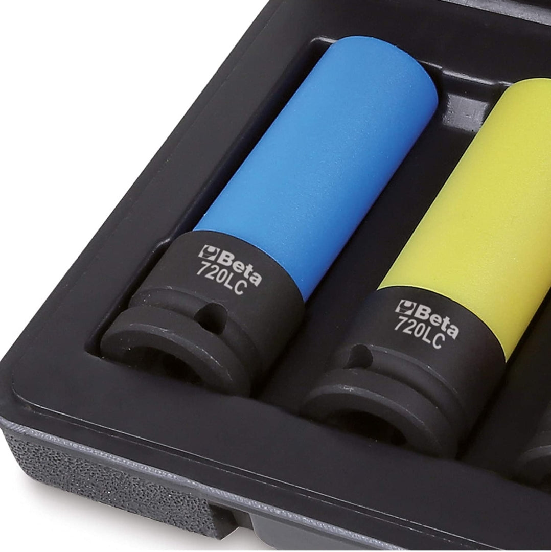 Serie di 3 chiavi a bussola macchina Beta 720LC/C3 con attacco quadro femmina 1/2 e bocca esagonale per dadi ruote con inserti polimerici colorati. Le chiavi a bussola 720LC marca Beta permettono di rispondere a qualsiasi esigenza di serraggio o disserra Macchina Per Dadi Ruote BETA 720 CHIAVE A BUSSOLA MACCHINA ESAGONALE 1/2 32mm Chiavi A Bussola Beta Bussole a macch plast. Colored 1/2 lc 19