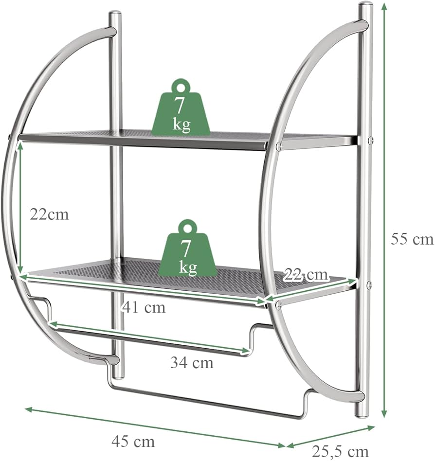 Evitare di sovraccaricare lo scaffale. Aspetto moderno: la mensola da doccia è a forma di mezzaluna, che riduce notevolmente la possibilità di danni da collisione ed è quindi più sicuro. Porta Asciugamani Da Parete Bagno Acquista Porta Asciugamani Da Bagno Pieghevole Montaggio A Parete Mobile Con Gancio Per Doccia Portasciugamani Senza Foratura Asta Appendiabiti Per Doccia In Alluminio Accessori Per Il Bagno In Italia A Partire Da Mensola Porta Asciugamani Amazon Porta Asciugamani Bagno Porta Asciugamani Da Parete in Acciaio Due Mensole Porta Oggetti DocciaDimensioni del prodotto: 25L x 45l x 54H cm. Colore: acciaio.Ampio spazio per asciugamani, accessori bagno e molto altro ancora.Facile e veloce da montare. Due Lo scaffale a forma di mezzaluna non solo ha un aspetto moderno, ma è anche più sicuro e previene danni da collisione. Pulire e asciugare regolarmente lo scaffale per evitare la ruggine. Design intelligente: i 2 ripiani sono dotati di molti piccoli fori per evitare l'accumulo di acqua e garantire una conservazione asciutta. Informazioni sul prodotto: Colore: argento. Materiale: ferro. Uso efficiente dello spazio: grazie a 2 ripiani e 2 aste per asciugamani, questo scaffale da bagno offre un uso efficiente dello spazio e consente di riporre ordinatamente diversi oggetti. Materiale robusto: la mensola da parete è realizzata in ferro e cromata, che lo protegge efficacemente dalla ruggine e dalla corrosione e mantiene la sua lucentezza a lungo. Descrizione prodotto Descrizione del prodotto: Questo moderno scaffale da bagno realizzato in ferro robusto e finitura cromata offre un uso efficiente dello spazio con 2 ripiani e 2 aste per asciugamani. Dimensioni: circa 45 x 25,5 x 55 cm (lunghezza x larghezza x altezza). Peso: circa 2 kg. Montaggio a parete salvaspazio. Materiale robusto in ferro, cromato per protezione dalla ruggine.
