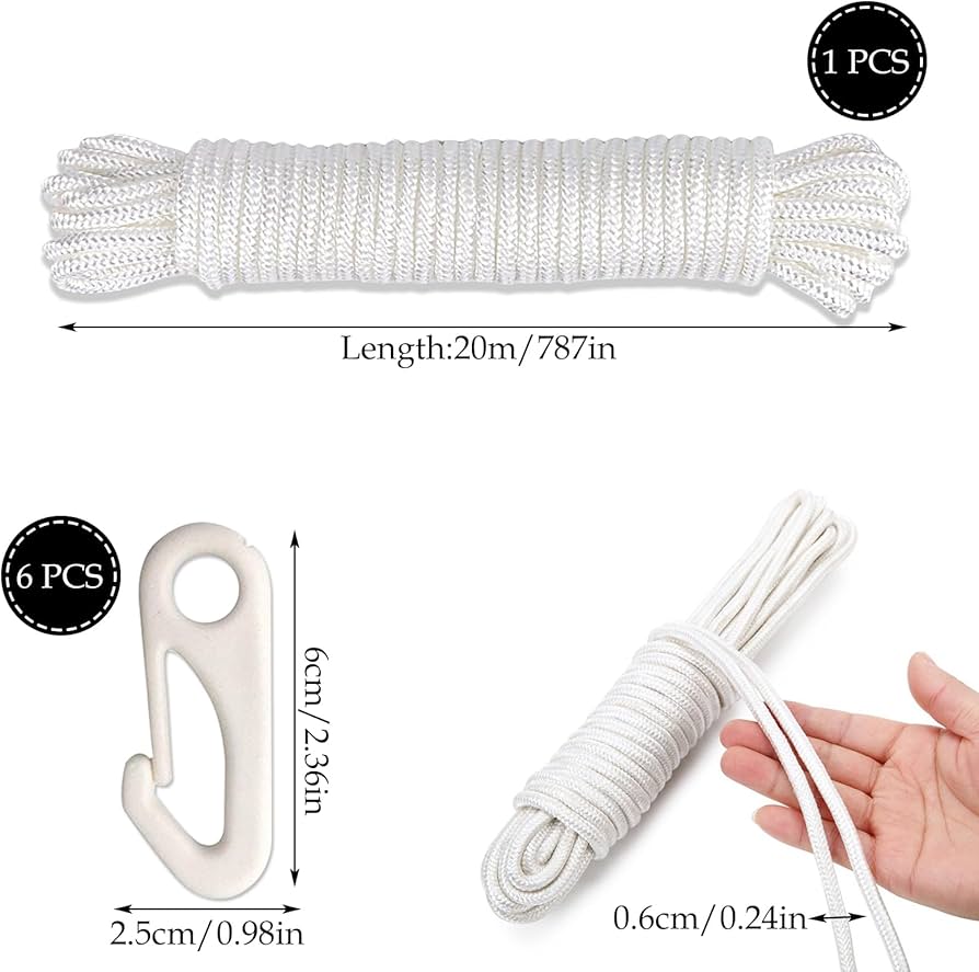 Jognee Corda Per Bandiera, 24 M, Con 8 Ganci, Diametro 6 Mm, Resistente Alle Intemperie E Ai Raggi UV, In Nylon Bianco, Per Giardino, Corda Per La