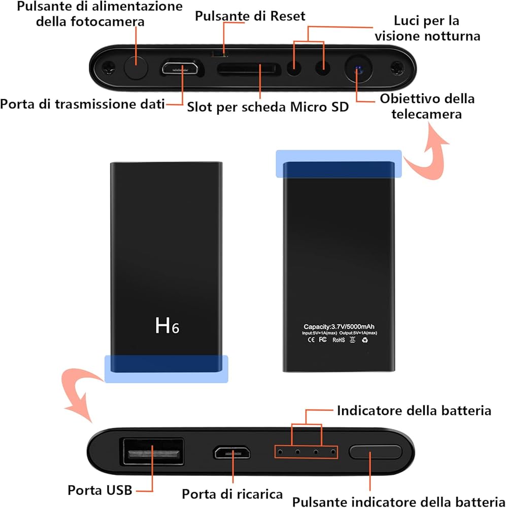 【Registrazione Video Visione Notturna】Dotato di luci di visione notturna a infrarossi integrate, il microcamera spia attiva automaticamente la modalità di visione notturna in condizioni di scarsa luminosità o buio per una registrazione video chiara. 【Funzione Sensore di Gravità】Indipendentemente dall'orientamento, il telecamera nascosta registra nella corretta direzione, offrendo una registrazione video senza preoccupazioni. Micro Camera Spia Nascosta TANGMI Telecamera Nascosta Spia, 1080P HD Telecamera Nascosta Power Bank, Sensore Di Gravità Telecamera Spia Con Visione Notturna Per La Ricarica Dei Dispositivi Mobili : Amazon.it: Elettronica Microtelecamera Nascosta Spia Visione Notturna Automatica Con luci integrate per la visione notturna a infrarossi, il telecamera spia passa facilmente alla modalità di visione notturna in condizioni di scarsa luminosità o buio per una maggiore chiarezza video. 【Tempo di Registrazione Prolungato】Dopo una carica completa, il mini telecamera spia nascosta può registrare circa 18 ore di video in alta definizione 1080P a 30 fps, garantendo una qualità video fluida 【Ricarica Dispositivi Mobili】La batteria integrata supporta la ricarica dei dispositivi mobili, fungendo da fonte di alimentazione di backup affidabile. Marca: TANGMI. Telecamera Spia, 1080P HD & Visione Notturna Portatile Telecamera Nascosta con Rilevamento di Movimento per Registrazione Video e Scattare Foto 5000 mAh Questo telecamera nascosta è dotato di una batteria integrata da 5000 mAh, garantendo fino a 18 ore di funzionamento continuo, microcamera spia fungendo da fonte di alimentazione di backup affidabile per alleviare le preoccupazioni sulla durata della batteria. Il suo sensore di gravità e la visione notturna automatica ne migliorano l'adattabilità in varie situazioni; Equipaggiato con un cavo dati 3-in-1 per ricaricare diversi dispositivi La funzione di registrazione in loop gestisce lo spazio di archiviazione eliminando i file più vecchi quando lo spazio scarseggia