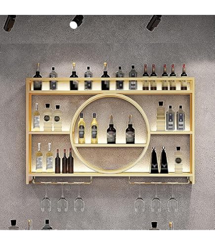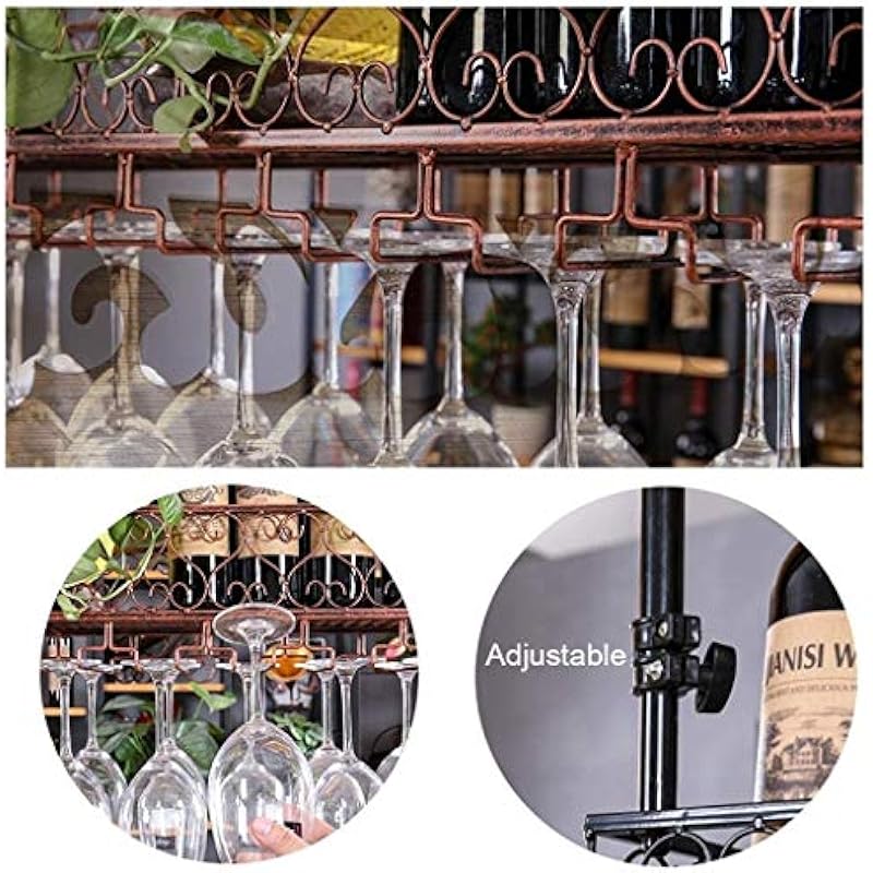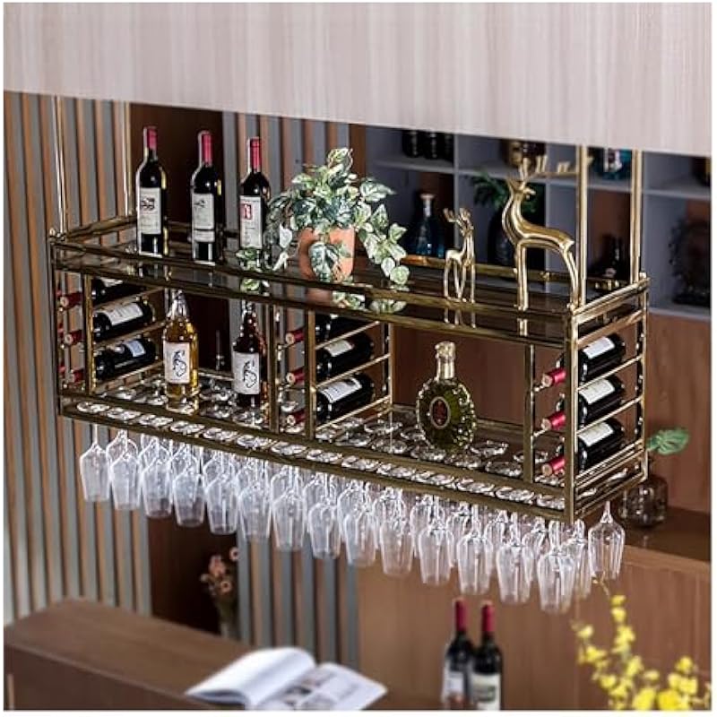 Portabottiglie Per Vino BELELUCKY Portabottiglie Portabottiglie Unità Bar Mensole Galleggianti Portabottiglie Da Parete Portabottiglie Da Vino Sospeso Al Soffitto Portabottiglie Da Appendere Design appeso: Il portabottiglie a 2 livelli, con struttura in metallo e divisori in legno, offre uno spazio di stoccaggio stabile. portabicchieri soffitto colore parete calici scaffale vino Risparmio di spazio: L'unità compatta montata a parete massimizza lo spazio verticale e fornisce un ampio spazio di archiviazione per la vostra collezione di vini. Organizza ed espone i bicchieri di vino e libera spazio prezioso su scaffali/armadi. La caratteristica principale è il portabicchieri integrato che espone elegantemente i bicchieri da vino, mentre il ripiano superiore è il luogo perfetto per oggetti decorativi o per riporre oggetti extra. Facile da installare: Il portabottiglie appeso può essere installato sul cemento o sul soffitto, consentendo di trasformare lo spazio senza sforzo in breve tempo. Il design aperto non solo facilita l'accesso alle bottiglie, ma trasforma il vino in un'esposizione visivamente accattivante.