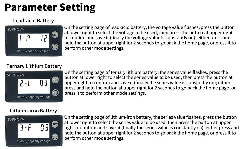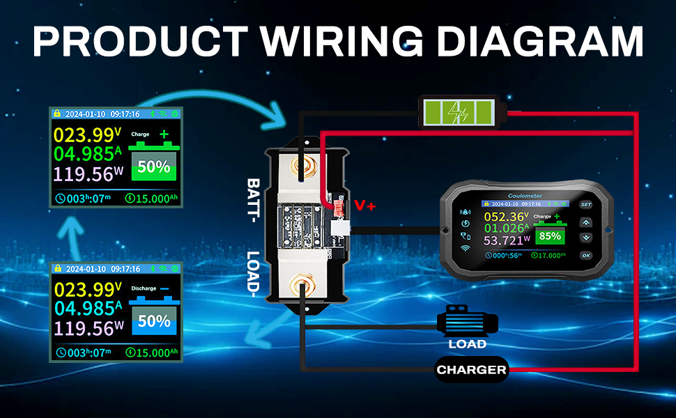 Avviso di batteria scarica personalizzato: è possibile impostare liberamente la soglia di avviso di batteria scarica in base alle proprie esigenze, ricordando in tempo l'insufficienza di energia, evitando in modo efficace l'improvvisa interruzione dell'alimentazione dell'apparecchiatura e garantendo la sicurezza del funzionamento. Installazione comoda: batteria monitor grazie al design a scatto, il dispositivo può essere adattato a piastre di montaggio di diverso spessore per consentire un montaggio senza adesivo. Display LCD: i parametri della batteria vengono visualizzati in tempo reale sullo schermo LCD: corrente, tensione, potenza SOC (percentuale), capacità, potenza, tempo rimanente, temperatura del campionatore, stato di carica e scarica, ecc. Monitoraggio wifi della batteria: monitoraggio remoto WiFi tramite l'APP Junce Home, per controllare lo stato di funzionamento della batteria in qualsiasi momento e in qualsiasi luogo; è inoltre possibile impostare funzioni complete per il monitor della Abbandona il cavo di schermatura, è più comodo da usare e più compatto nello spazio. Precauzioni: 1. In caso di utilizzo prolungato in base alla corrente massima, assicurarsi di mantenere la ventilazione e la dissipazione del calore. 2. Non aprire, smontare, riparare, manomettere o modificare il campionatore incorporato. Descrizione prodotto Tester di capacità della batteria, Voltmetro indicatore del livello della batteria DC 8-80V 100A, Monitor LCD ad alta precisione della batteria (TN10) Campionatore incorporato: questo monitor della batteria è dotato di un campionatore incorporato ad alta precisione, che garantisce dati di misurazione rapidi e accurati, il monitoraggio in tempo reale dello stato della batteria e una maggiore efficienza lavorativa. Tester Batterie 100A Wifi Monitor Batteria 12V 24V 36V 48V 72V Monitor Batteria Batteria 48v Limite di tensione: il dispositivo di battery monitor supporta l'impostazione indipendente della tensione da capacità zero a piena capacità, applicabile a batterie al litio, al litio ferro fosfato, al piombo acido, ternarie e ad altri tipi di pacchi batteria, per ottimizzare la strategia di gestione della carica. Campionatore incorporato: il monitor batteria è dotato di un campionatore incorporato ad alta precisione per garantire dati di misurazione rapidi e accurati e il monitoraggio in tempo reale dello stato della batteria, che può essere utilizzato per veicoli elettrici, alimentazione di emergenza, alimentazione di accumulo di energia, contatori, strumenti e altri dispositivi che utilizzano batterie. 10 livelli di regolazione della luminosità: design umanizzato che offre 10 livelli di regolazione della luminosità, da morbida a brillante, per consentire a chi si trova in ambienti interni ed esterni di visualizzare comodamente le informazioni sullo schermo. Display LCD: consente di regolare la luminosità e di visualizzare comodamente le informazioni sullo schermo, mentre i parametri della batteria sono visualizzati sullo schermo LCD in tempo reale: corrente, tensione, potenza SOC (percentuale), capacità, potenza, tempo rimanente, temperatura del campionatore, stato di carica e scarica, ecc. Avviso batteria personalizzato: è possibile impostare liberamente la soglia di avviso di batteria scarica in base alle proprie esigenze, in modo da essere avvisati in tempo dell'insufficiente alimentazione, evitando l'improvvisa interruzione dell'alimentazione del dispositivo e garantendo la sicurezza operativa.