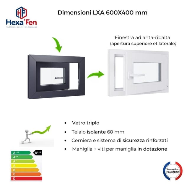 LORAC|Finestra in PVC antracite-bianco 600x400 mm,ribaltabile,finestra standard con doppia vetratura,a risparmio energetico,finestra per cantina con certificazione CE,ideale per abitazioni e cantine Struttura sicura ed ecologica – Conforme a tutte le normative europee, tra cui EN 14351-1+A2:2018 (emissione di sostanze pericolose), e dotata di un set completo di montaggio per un'installazione semplice e sicura. Resistente all’acqua e al vento – La finestra ha una classe di impermeabilità all’acqua 7A (EN 12208:2001) e una resistenza al carico del vento di classe C4 (EN 12210:2017 / EN 12211:2017), ideale per ogni condizione climatica. Finestre In Pvc Aluplast - Finestra In Plastica Bianca, 100 X 60 Cm (larghezza X Altezza), Finestra Del Garage, Finestra Del Giardino, Finestra Della Cantina, 2 Vetri – DIN Sinistra – Funzione Girevole : Amazon.it: Fai Da Te Finestre In Pvc Per Porte Profondità costruttiva di 58 mm per un migliore isolamento termico. Profilo a 4 camere di alta qualità – La finestra è dotata di un profilo in PVC a 4 camere, rinforzato con acciaio zincato, che garantisce eccellente stabilità e lunga durata.