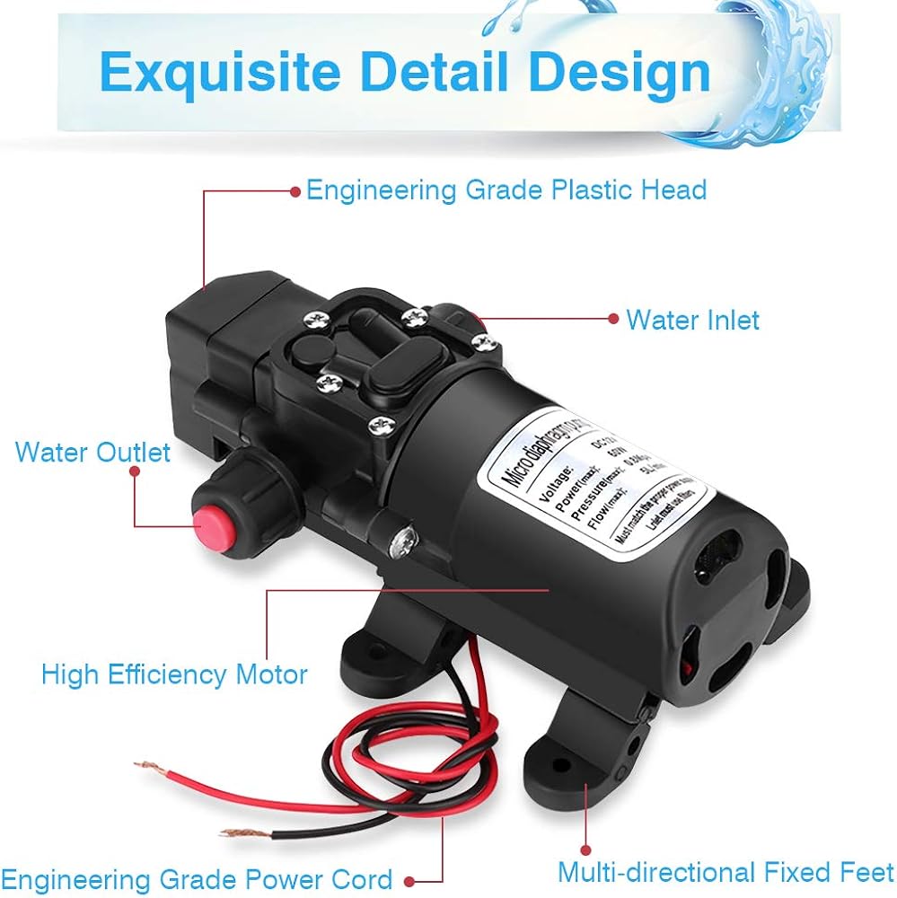 Mxmoonant Pompa Dell'acqua Automatica 12V DC , Pompa Ausiliaria, 40 Psi, 2,8 Bar, 130W, 17 Lpm/min, Autoadescante, Protezione Da Sovraccarico, Per Roulotte, Barca, Lavaggio, Irrigazione Giardino Pompa Acqua A Batteria 12V DC 100W 8L/Min 160Psi Pompa Acqua Ampia gamma di applicazioni --- Le pompe dell'acqua autoadescanti sono ampiamente utilizzate, come la rondella dell'automobile, l'acqua solare, l'attrezzatura idraulica telecomandata, in alcuni punti è necessario controllare frequentemente l'interruttore economizzatore d'energia da qualche parte per la pompa ad acqua ad alta pressione della pompa a membrana f/cm2), l'alimentazione elettrica verrà automaticamente interrotta e il motore della pompa si fermerà. Tagliare automaticamente l'alimentazione quando intasato --- Quando l'uscita dell'acqua della pompa è completamente bloccata (nessuna perdita d'acqua e la pressione raggiunge il valore massimo di 11 kg. Guida alle istruzioni --- La freccia di istruzioni sulla superficie della pompa guida il flusso d'acqua e lo guida verso il lato dell'acqua di uscita per la pompa dell'acqua della pompa di richiamo della pressione dell'acqua della pompa dell'acqua di 12v 90 psi Pompa Acqua 12v Bomba De Agua 12V DC 100W 8L/Min 160Psi Diafragma De Alta Presión Pompa 12 Volt Per Acqua Alta efficienza --- L'autoadescante è un sistema di collegamento stabile e conveniente, potente pompa a pressione automatica, estremamente alta efficienza, consumo di corrente estremamente basso e fornisce un'uscita ad alta capacità per la pompa dell'acqua della pompa dell'acqua del camper