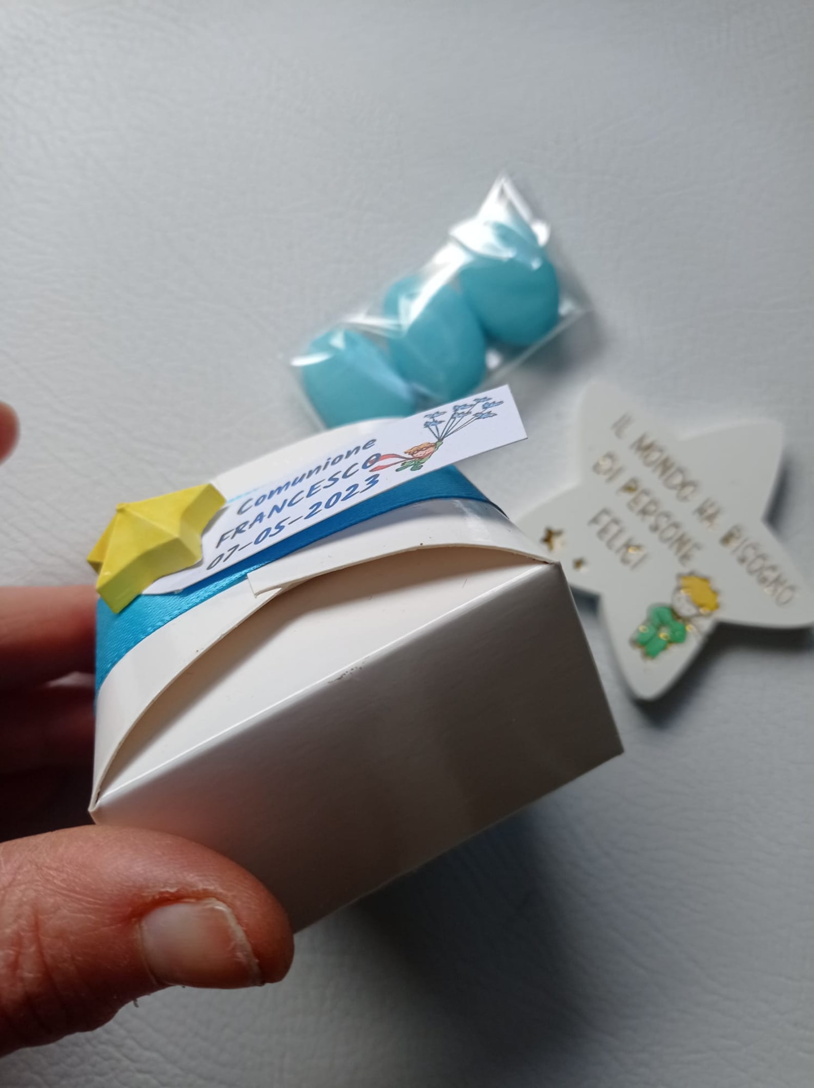 Set da 16 pezzi tutti diversi – Nessuna ripetizione: ogni calamita ha una frase e un’illustrazione unica. Bomboniera adatta a ogni cerimonia – Perfette per Comunione, Cresima, Battesimo, Matrimonio e Anniversario. 16,90 €. Contenitore Vassoio … 16,90 €. Cornetto della fortuna Pireta ... Ahi ahi ahi, mi sembra quasi di vederti, lì dall'altra parte … Leggi di più Calamita Piccolo Principe Miglior Prezzo Sacchetti Portaconfetti Bomboniere Piccolo Principe - Feste - Bombo Piccolo Principe Bomboniere Produzione italiana – Prodotto realizzato in Italia con cura artigianale e attenzione alla qualità. Ideali anche per insegnanti, colleghi e alunni – Un piccolo pensiero capace di trasmettere un grande messaggio. Formato pratico e versatile – Possono essere attaccate a qualsiasi superficie magnetica: frigoriferi, armadietti, lavagne e molto altro. Facili da confezionare – Possono essere abbinate a sacchetti, scatoline o bustine, rendendole perfette per la presentazione in eventi e cerimonie. Grafica assortita e curata nei dettagli – Illustrazioni delicate e poetiche che rendono ogni calamita unica e speciale.