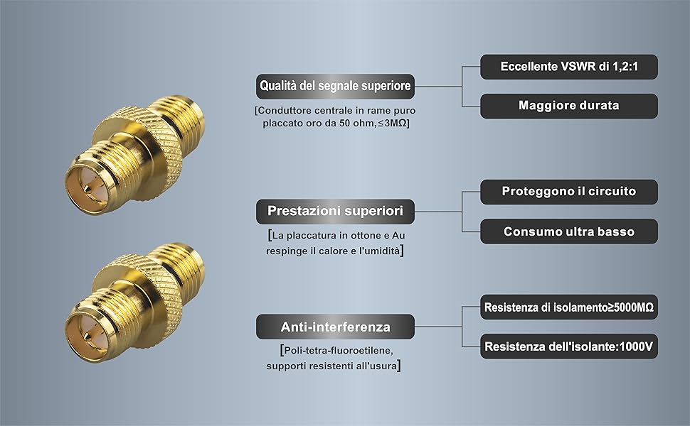 Boobrie 2PCS SMA Femmina a RP SMA Maschio Placcato Oro Connettore SMA Femmina a RP-SMA Maschio Adattatore SMA Femmina Estensione per FPV Drone Segnale Booster Dispositivo LAN Wireless Se avete domande, non esitate a inviarci un'e-mail e saremo lieti di rispondere per voi. Ciò contribuisce a mantenere una buona qualità del segnale nel tempo e riduce il rischio di degradazione o perdita del segnale. √Prestazioni:La placcatura in oro 0,05 fornisce un contatto elettrico altamente conduttivo e duraturo, resistente alla corrosione e all'ossidazione. √Confezione e servizio: 2 connettori RF coassiali RP SMA maschio a RP SMA femmina dritti 0,05 placcati oro. Connettore Sma Boobrie 2PCS SMA Femmina A RP SMA Femmina (vite Esterna Pin Interno) 0 Connettore Antenna Tv Inoltre, può trasferire i segnali in modo più efficace e con meno interferenze rispetto ad altri metalli.