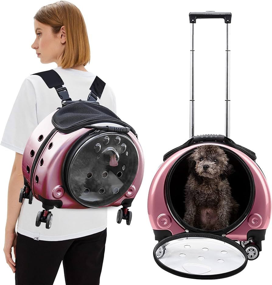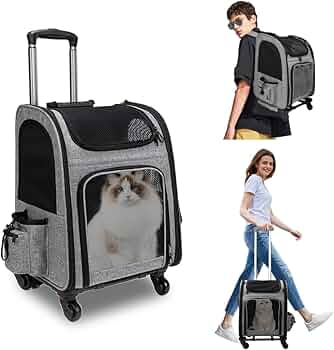 PETCUTE Zaino Trolley Per Cani Gatti,Buona Ventilazione,Zaino Per Gatti Con Tappetino Rimovibile,Comoda Maniglia,Pieghevole Trasportino Gatto Con Ruote Per Cani Piccoli Gatti Medi Fino 7.5 KG