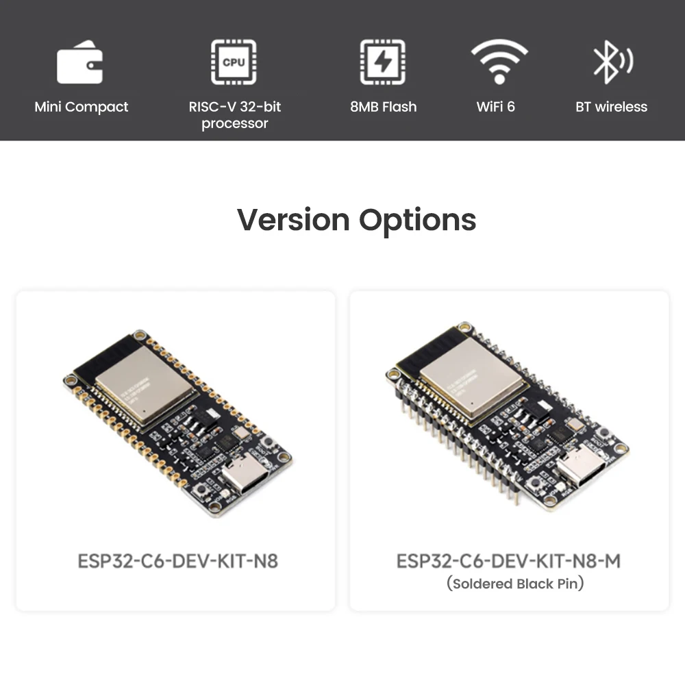 com/wiki/ESP32-C6-DEV-KIT-N8 Comes with online examples and tutorials for ESP-IDF development environment Esp32 Wroom Wsidrnty Scheda Di Sviluppo ESP32 C6 WiFi6 Bluetooth 5 Zigbee Thread 160 MHz Processore Single Core Modulo ESP32 C6 WROOM 1 N8(B Esp32 C6 Specs Microcontrollore ESP32 C6, scheda di sviluppo WiFi 6, processore single core da 160 MHz, modulo serie ESP32 C6 WROOM 1 NX, supporta lo sviluppo USB e UART In terms of hardware, it adopts ESP32-C6-WROOM-1 module with a RISC-V 32-bit single-core processor. ESP32-C6 WiFi 6 microcontroller development board adopts ESP32-C6-WROOM-1-N8 module, which is equipped with RISC-V 32-bit single-core processor, up to 160MHz main frequency, built-in 8MB Flash Onboard CH343 and CH334 USB HUB chips, supports USB and UART development at the same time via a USB-C port -- Integrated 320KB ROM, 512KB HP SRAM, 16KB LP SRAM, and 8MB Flash memory. -- Integrated 2.4GHz WiFi 6, low-power Bluetooth (Bluetooth LE), and IEEE 802.15.4 (Zigbee 3.0 and Thread) wireless communication, with superior RF performance. Integrates WiFi 6, Bluetooth 5 and and IEEE 802.15.4 (Zigbee 3.0 and Thread) wireless communication, with superior RF performance Integrates rich peripherals including SPI, UART, I2C, I2S, LED PWM, SDIO and other interfaces, compatible with the pinout of ESP32-C6-DevKitC-1-N8 development board, more convenient to use and expand a variety of peripheral modules Overview The ESP32-C6-DEV-KIT-N8 is a compact microcontroller development board with multiple peripheral interfaces. -- The castellated module allows soldering directly to carrier boards. Features -- Adopts ESP32-C6-WROOM-1-N8 module with RISC-V 32-bit single-core processor, up to 160MHz main frequency, built-in 8MB Flash. Onboard CH343 UART and CH334 USB HUB chips, it supports USB and UART development at the same time via a USB-C port.