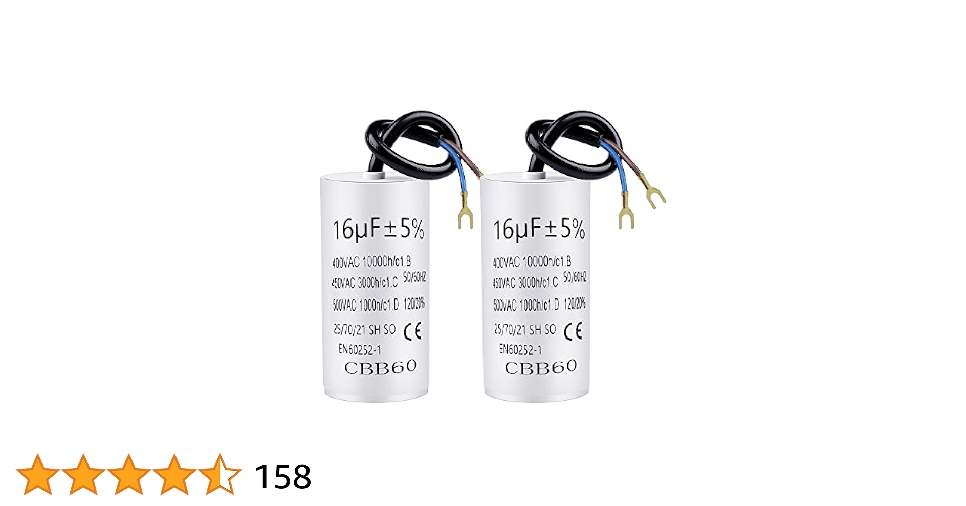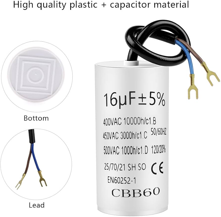 CBB60 450 V 20uf Condensatore di avviamento, 50/60HZ rimozione condensatori avviamenti funzionamento microfarad con fili M8 per motore elettrico a secco biancheria pompa piscina condizionatore d'aria 【Ampiamente usato】 Motori CA monofase, come micropompe dell'acqua, compressori, motori, ventilatori a soffitto, condizionatori d'aria, lavatrici ed elettrodomestici Dimensioni del prodotto: 38 x 74 mm 【Elevata resistenza di isolamento】 Condensatore industriale, prestazioni stabili, perdite non tossiche, elevato isolamento termico, bassa perdita di capacità di corrente della linea del pacchetto, forte capacità di autoriparazione, elevata resistenza di isolamento Il condensatore di avviamento del motore è piccolo, leggero e facile da usare Condensatore 25uf Condensatore 10uf CBB60 Condensatore Di Avviamento Motore 450V 8uf Compressore Per Frigorifero 【Alimentatore CA 50/60 Hz】 I condensatori del motore sono adatti per l'avvio del sistema CA 50/60 Hz e migliori prestazioni del motore