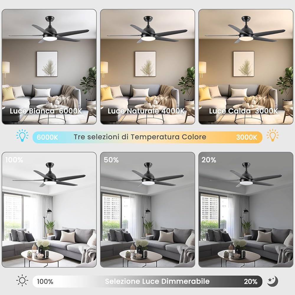 L'angolo di inclinazione è inferiore a 15°. Non è necessario alzarsi nel cuore della notte per spegnerlo e si può evitare di dimenticarsi di spegnerlo, riducendo così il consumo energetico. Controllare il ventilatore da soffitto non è mai stato così facile: puoi azionare il ventilatore e la luce da qualsiasi punto della stanza. È inoltre possibile regolare la velocit à del vento e supportare la funzione di spegnimento pianificato. RPM 7 Modalità di Selezione: Il ventilatore da soffitto da 52 pollici ha 6 selezioni di velocità del vento e selezione della modalità sleep.1 velocità: 6.4W-120RPM; 2 velocità: 9.4W-140RPM; 3 velocità: 13.3W-160RPM; 4 velocità: 18.4W-176RPM; 5 velocità: 23.8W-191RPM; 6 velocità: 29.4W-205RPM, è possibile scegliere la velocità del vento in base alle proprie esigenze. Il nostro ventilatore da soffitto con luce è dimmerabile (10%-100%), premere ‘+/-’, può soddisfare le esigenze di diverse scene Adatto per soggiorno, camera da letto, ufficio, studio o altro spazio Perché il ventilatore da soffitto non si spegne quando ho impostato il timer? Non è possibile premere un altro pulsante dopo aver impostato la funzione timer, altrimenti il timer non funzionerà. Funzione di Memoria: Selezionare prima la temperatura di colore della luce desiderata e accenderla per più di 3 secondi. Luce Personalizzabile: Un pulsante per cambiare la temperatura del colore della luce, luce calda 3000K (‘WW’), luce naturale 4200K (‘NW’), luce bianca fredda 6500K (‘DW’); premere a lungo ‘DW’; premere a lungo ‘DW’; premere a lungo ‘DW’. Inoltre, forniamo anche un supporto tecnico 24 ore su 24. Potete contattarci in qualsiasi momento se avete problemi durante l'uso o l'installazione del ventilatore. È possibile utilizzare l'interruttore a parete per controllare l'accensione e lo spegnimento delle luci, ma non è possibile utilizzare l'interruttore a parete per attenuare le luci e controllare il ventilatore (Interruttore a parete non incluso) 1 Colore e Dimmerabile 2 Funzione di Memoria 3 Dimmerabile 100% 4 Dimmerabile 50% 5 Dimmerabile 10% Il ventilatore funziona a un volume inferiore a 35decibel, ultra-silenzioso, con il solo rumore del vento. La venatura del legno ha un aspetto naturale e caldo, in grado di aggiungere un'atmosfera calda allo spazio, creando una sensazione di vicinanza alla natura, adatta allo stile retrò. Motore CC Reversibile: I ventilatori da soffitto a corrente continua possono tenere caldo in inverno e fresco in estate. Premere “1/2/3/4/5/6” per controllare 6 velocità; premere “WW” per la luce calda (tenere premuto: temperatura del colore “K-”), ‘NW’ per la luce diurna, “DW” per la luce fredda (tenere premuto: temperatura del colore K+); premere + - per regolare la luminosità della luce; premere la freccia inversa per passare alla modalità invernale; e premere 1H/3H/6H per spegnerla a intervalli regolari; premere la luna per impostare la modalità sleep; Viene fornito anche con una staffa di supporto può essere montato a parete per il telecomando In estate, è impostato per ruotare in senso antiorario (rotazione positiva), le pale del ventilatore spingono l'aria verso il basso, accelerando il flusso d'aria e soffiando rapidamente l'aria interna, creando un ambiente più fresco e favorendo la circolazione dell'aria interna. 1 2 Metodi di Controllo 2 Dimensioni e Montaggio 3 Energetico CC Motore 4 Facile da Installazione 5 Kit di Luci LED da 24W '); premendo a lungo ‘WW’ è possibile regolare in continuo la temperatura del colore da luce fredda a luce calda (da 6500K a 3000K), premendo a lungo ‘DW’ è possibile regolare in continuo la luminosità da luce calda a luce fredda (da 3000K a 6500K); Lumen ≥2300lm. L'argento conferisce una sensazione di semplicità e luminosità, adatta a stili moderni e minimalisti, scandinavi e altri. Telecomando Multifunzione: Il ventilatore da soffitto con telecomando è facile da usare. La maggior parte dell'installazione della luce del ventilatore da soffitto è già stata fatta, le parti rimanenti sono facili da installare Timing OFF Function: Il ventilatore da soffitto è dotato di un dispositivo di temporizzazione a tre ingranaggi che consente di impostare il tempo di funzionamento rispettivamente per 1 ora (premere ‘1H’), 3 ore (premere ‘3H’), 6 ore (premere ‘6H’). Lampadario Con Ventilatore Da Soffitto CJOY Ventilatore Da Soffitto Con Luce, 132cm Ventilatore Da Soffitto Lampadario Ventilatore Da Soffitto Piedi cubi al minuto fino a 4800 1 Sei Velocità 2 Sonno Silenzioso 3 DC Reversibile 4 Impostazione Timer 5 Materiale Robusto Se si desidera accendere il ventilatore, è possibile premere direttamente il numero ‘1/2/3/4/5/6’ per accendere il ventilatore, e poi è possibile fare clic sul pulsante centrale circondato da numeri per spegnere il ventilatore Quando lo si utilizza in camera da letto, non disturba il sonno a causa del suono di attrito; quando lo si utilizza in sala studio, non interrompe le idee di lavoro e di studio,creando un ambiente tranquillo e confortevole Non è necessario pagare alcun costo. È possibile scegliere il colore delle pale del ventilatore più adatto all'arredamento della propria casa! 100% di Soddisfazione: Attribuiamo grande importanza all'esperienza d'uso del cliente e forniamo una garanzia di 24 mesi senza preoccupazioni per ogni cliente.