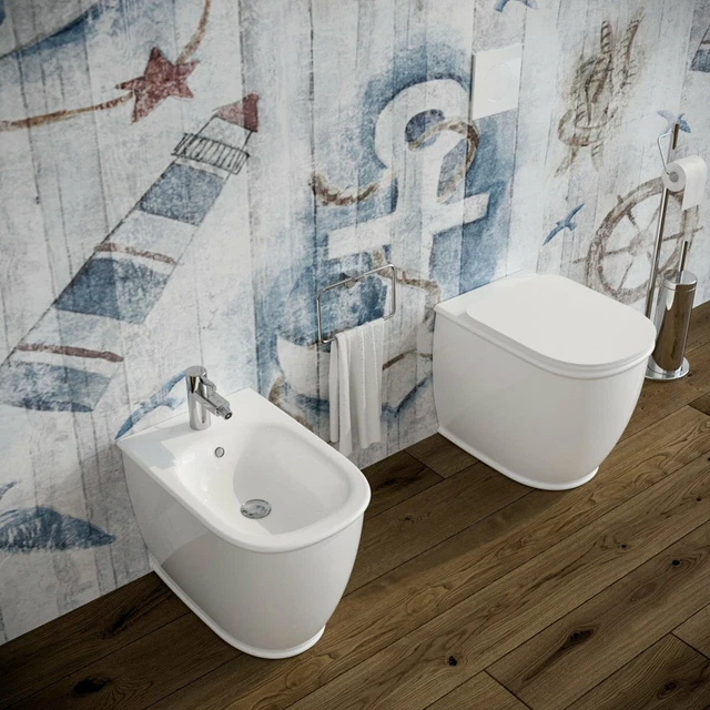 Sanitari filomuro Azzurra Comoda wc + bidet in ceramica + sedile avvolgente.La collezione comoda si adatta ad ogni ambiente bagno , soprattutto ad ambienti con cura nei dettagli. Le forme morbide rendono la linea elegante e confortevole. Il colore dei san Coprivaso frizionato Soft Close, (con chiusura rallentata) in termoindurente Sanitari a terra classico filo muro Mod. Epoca Forme morbide e arrotondate che ricordano le geometrie eleganti del passato sono perfettamente reinterpretate in chiave moderna. Dimensione Bidet filo muro Cm 54 x 36 H 40 Wc Filo Muro Prezzo SANITARI MURO: VASO, COPRIVASO BIDET, ELIOS PLUS AZZURRA Sanitari Bagno Serie completa composta da Vaso + Coprivaso Soft close + Bidet