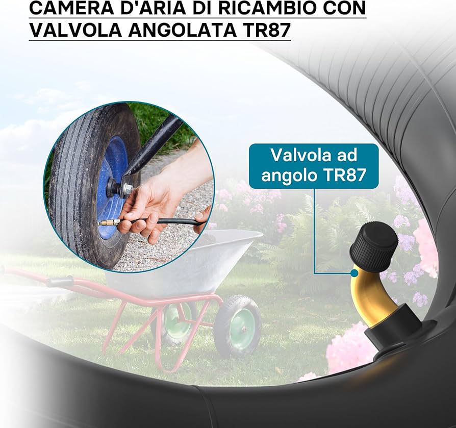 Queste camere d'aria di alta qualità garantiscono sicurezza in ogni stagione e in qualsiasi condizione atmosferica. Fino a 4 volte più resistenti rispetto alle camere d'aria standard, viene testato con diversi processi prima di lasciare lo stabilimento per garantire la qualità di ogni unità. Camera D Aria Carriola 3.50-8 MOOVMOOV 2x Camere D'aria 15x6.00-6 Valvola Angolata TR87 - Camere D'aria Di Ricambio Riparazione Gomme Camera D'aria Compatibile con pneumatici di dimensioni equivalenti, garantendo un'installazione rapida e una vestibilità ottimale. Ad esempio, i diavoli, carrelli da giardino, rimorchi da giardino, compressori d'aria o idropulitrice, kart bike, scooter, pocket bike e molto altro. La vostra soddisfazione è la nostra missione. Camera d'aria di ricambio macchine agricole TR87 6 3.50-6, 4.00-6, 4.10-6 · Pronta Consegna · Spedizione gratuita · Reso sicuro ✅ Valvola a gomito TR87 ●● Questa camera d'aria da 3,50-6 pollici ha una valvola a gomito TR87. In base alle tue esigenze, controlla attentamente l'orientamento della valvola perché questo riferimento esiste anche nella valvola destra. Prima di procedere con l'acquisto, verificare l'orientamento della valvola della camera d'aria originale. Inoltre, non esitate a chiederci se avete una domanda sulle dimensioni.