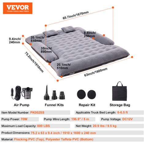 IN STOCK: VEVOR Materasso ad Aria per Camion, per 6-6,5 Piedi di Grandi Dimensioni, Letto da Campeggio Gonfiabile con Pompa ad Aria 12V 2 Cuscini, Borsa per Il Trasporto, KCCQCD665FT0V3L0WV9 al miglior prezzo. Consegna rapida in tutta Italia Compatibilità versatile: misurando 75,20 x 63,0 x 9,45 pollici (1910 x 1600 x 240 mm), questo materasso ad aria per camion da 6-6,5 piedi si adatta a vari modelli di camion, tra cui Chevrolet Silverado, Dodge Ram, Ford 150/250/350, Gmc Sierra, Nissan Titano, Toyota T100, Toyota Tundra. Capacità di carico di 600 libbre: utilizzando un avanzato tester di tenuta a gravità, questo materasso ad aria gonfiabile per camion è sottoposto a test rigorosi per garantire che possa supportare fino a 800 libbre senza perdite. Materiali di prima qualità: il materasso ad aria del pianale del camion è realizzato con una parte superiore in PVC floccato di alta qualità, lati in PVC resistente e un fondo in PVC tufo di poliestere resistente con uno spessore di 0,02/0,5 mm. Con airbag su entrambi i lati, può essere gonfiabile per materassi a grandezza naturale e una struttura portatile e pieghevole per un facile stoccaggio e trasporto. Materasso Ad Aria Tenda Gonfiabile Per Campeggio 3-5 Persone Tenda Da Campeggio Con Pompa Materasso Gonfiabile Per Campeggio Il suo design robusto può ospitare comodamente 2-3 persone, offrendo un'esperienza riposante.