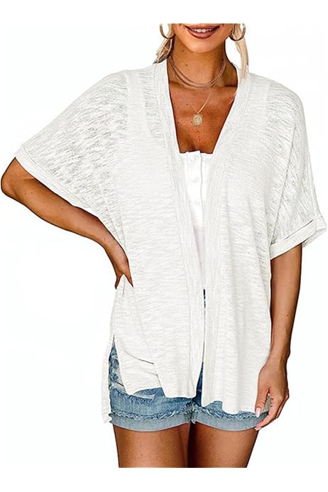 Cardigan Donna Elegante Cardigan Da Donna Estivo Senza Maniche, Lungo, Leggero, Casual Cardigan Estivo Caratteristiche: davanti aperto, maniche corte arrotolate, tinta unita, orlo diviso su entrambi i lati, abbastanza lungo da coprire i glutei, vestibilità ampia, cardigan leggero da donna, cardigan a maniche corte da donna. Occasione: questo vestito solido di base è adatto per vacanze, casa, tempo libero quotidiano, shopping, ufficio, strada, o può essere utilizzato come copertura estiva da spiaggia, primavera, estate e autunno, soprattutto nelle stagioni. Poncho da spiaggia aperto frontale: l'orlo di questo cappotto da spiaggia è corto e lungo abbastanza lungo da coprire i fianchi, in modo da potersi muovere liberamente senza preoccuparsi di togliersi.