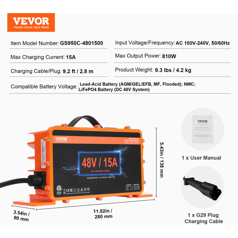 VEVOR Caricabatteria Per Carrello Da Golf Da 48 Volt 15 AMP Caricabatteria Intelligente Con Spina G29 810 W Compatibile Con Batterie Al Piombo Agm G 92566909