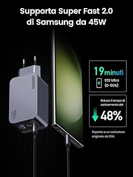 [ Ricarica Multiporte Simultanea ] Le porte USB-C (C1 e C2) forniscono piena potenza di 100W se utilizzate da sole, alimentazione simultanea per laptop (65W) e pad (30W) per USB-C (C1 e C2) vengono utilizzate insieme e un'alimentazione simultanea dei tuoi dispositivi (45W + 30W + 22,5W) quando le tre porte USB-C vengono utilizzate insieme. [ Uno per Tutti ] UGREEN Nexode 100W caricabatterie GaN USB C a 4 porte supporta un'uscita totale fino a 100W, dispone di 3 porte USB C e 1 porta USB A per soddisfare tutte le tue esigenze. Compra UGREEN 100W Caricatore GaN Type C Multiplo Porte, Caricabatterie USB da Muro Compatibile con MacBook Pro/Air, iPad, iPhone 16, Galaxy S24 Ultra/ S23/ 22, Tablet ecc. SPEDIZIONE GRATUITA su ordini idonei. Passa a. Contenuti principali Informazioni s Power Bank Prodotto: 40747 - UGREEN 100W Caricatore GaN USB C 4 Porte, Alimentatore Multiplo USB, Caricabatterie USB Da Muro Compatibile Con MacBook Pro/Air, IPad Pro/Air/Mini, IPhone 13, Galaxy S24 Ultra/ S23/ 22, Tablet Power Bank Magsafe [ Ampia Compatibilità ] UGREEN caricabatterietore compatibile con MacBook Pro/Air M1 M2, Dell XPS 13 ''/15 '', Surface Pro, iPad Pro, Galaxy S24 Ultra/ S24+/ S24/ S23 Ultra/S23+/S23/S22 Ultra/S22/S21/20, Galaxy Tab S8/S7, iPhone 16 Plus Pro Max/15/14/13/12, Xiaomi Redmi Note 12 Pro/12/11 Pro/11/10, Switch console, Laptop ,Steam Deck ecc. Dimensioni compatti da 6,9 * 6,9 * 3,3cm che è facile da trasportare. Nota: Si prega di non caricare i dispositivi della serie iWatch con la porta USB A e altri dispositivi contemporaneamente. Efficienza fantastica con una minore generazione di calore in un design piccolo e leggero. 1 FAQ-1 2 FAQ-2 3 4 & 1 Porta/e 4 2 Porte 5 3 Porte