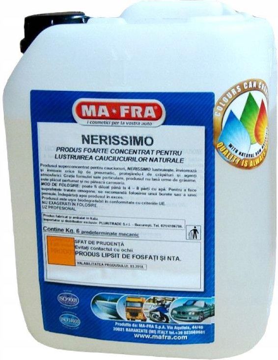 FALL OUT è un decontaminante cerchi e carrozzeria. Converte e dissolve chimicamente i residui ferrosi penetrati nella vernice. gomme cerchi extrem Grazie alla sua particolare formulazione non unge e non appiccica. Contenuto: 1000 ml. NERISSIMO consente di lucidare gli pneumatici con un semplice gesto, in poco tempo e con poca fatica. Si tratta di un lucidante adatto per tutti gli pneumatici, capace di rinnovare il colore nero originale delle gomme. NERISSIMO è un prodotto per lucidare e ravvivare qualsiasi tipo di pneumatico, preservandolo da screpolature ed agenti atmosferici. Il prodotto è altamente efficace e privo di acidi ed è ideale per tutti i cerchi in acciaio e lega leggera e anche per cerchi cromati e lucidati. Contenuto: 1 lNERISSIMO è un prodotto per lucidare e ravvivare qualsiasi tipo di pneumatico, proteggendolo da screpolature e agenti atmosferici. Il prodotto ha un pH neutro e per il suo odore caratteristico si consiglia di utilizzarlo in un luogo aperto e ben ventilato. Nero Gomme Mafra Decontaminante Cerchi Carrozzeria FALL OUT Lucida Protegge Gomme Mafra Cerchi