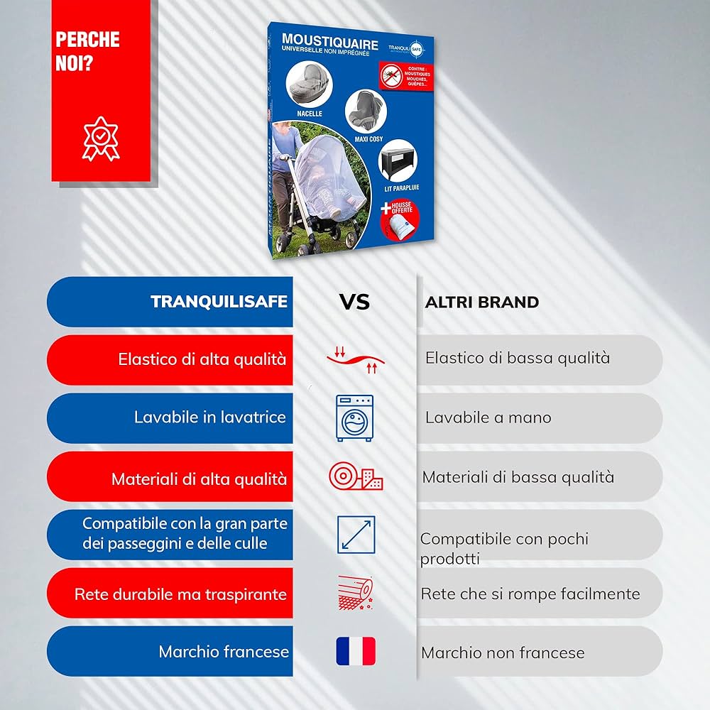 Per qualsiasi domanda sull'uso dei nostri prodotti, il nostro servizio clienti con sede in Francia rimane a vostra disposizione. La nuova versione, più grande, consente di proteggere il bambino nel suo lettino ad ombrello per la notte o per un pisolino all'aperto. Occupa pochissimo spazio e vi accompagnerà ovunque andiate. Poco ingombrante, vi accompagnerà in tutti i vostri spostamenti. È essenziale disporre di una protezione efficace e continua. La zanzariera per passeggino TRANQUILISAFE è universale, ti accompagna ovunque, si ripone in un batter d'occhio ed è molto resistente 🌞 ZANZARIERA ANTIZANZARE E ZANZARE TIGRE: In Italia, da maggio a novembre, le zanzare femmine fecondate pungono in ogni momento della giornata e sono portatrici di malattie (Zika, Dengue, Chikungunya, ecc.). La zanzariera per passeggino TRANQUILISAFE è universale, ti accompagna ovunque, si ripone in un batter d'occhio ed è molto resistente. I nostri prodotti sono certificati CE. 🌿 FACILE DA USARE, ECOLOGICA, NATURALE ED ECONOMICA: Grazie a un semplice elastico, la zanzariera per culla TRANQUILISAFE è facile da installare e adattare. TRANQUILISAFE offre una custodia portaoggetti per godere il più a lungo possibile della zanzariera per bambino. Leggero, puoi portarlo in una piccola tasca della borsa per il cambio o anche in borsa. Zanzariera Passeggino Universale Zanzariera Universale TRANQUILISAFE® – Zanzariera Per Carrozzina Passegino Culla E Lettino Neonato Di Tutte Le Dimensioni Protezione Antizanzare E Anti Mosche Borsa Di Stoccaggio Gratuita Antizanzare Bambini Senza insetticidi, senza veleni o prodotti chimici, è sicuro al 100% per i vostri bambini e garantisce loro una protezione continua. 💖 SODISFATTO O RIMBORSATO* - SERVIZIO CLIENTI IN FRANCIA. 👜 BORSA DI STOCCAGIO GRATUITA: Pratica, si può semplicemente riordinare la zanzariera nella sua borsa di stoccagio e portarla con sé ovunque si vada.