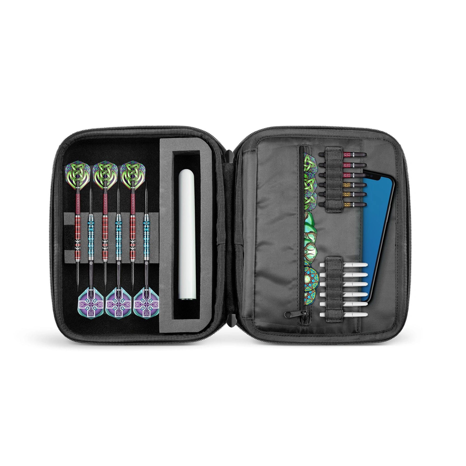 Con quindici tasche per voli extra, non sarai mai senza sostituzioni. Oltre allo stoccaggio delle freccette, il Pro può contenere un arsenale di forniture per freccette per tenerti sul bersaglio e le tue freccette in ottima forma. Soft Tip Casemaster Pro 9 Dart Leatherette Storage/Travel Case, Black, Cases Resin Pro Il Pro ha abbastanza spazio per adattarsi alle freccette più serie. Sia le freccette con punta in acciaio che le freccette con punta morbida si adattano perfettamente a questa elegante custodia. Esterno in Finta pelle nera The comprehensive dart storage package is here with the Casemaster Pro Nine Dart Leatherette Dart Case! Constructed from steadfast, tough leatherette around a hard resin shell, the Pro combines both enduring strength of materials with easy-to-carry portab Ogni freccetta è bloccata in posizione con un solido inserto in schiuma per evitare che le freccette si muovano, causando rotture. Con un sacco di spazio alle due estremità della custodia, non dovrai piegare i tuoi voli, portando a una maggiore durata di vita e una traiettoria di volo più vera. qualcosa dovrebbe andare storto.