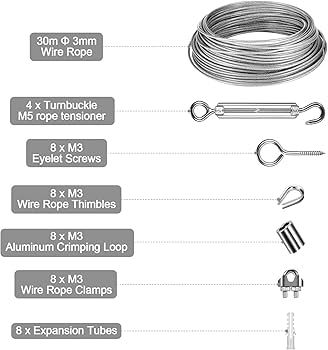 Cavo Acciaio 4mm Ruesious Set Di Sospensione Per Cavi In Acciaio Inossidabile, Fune In Nylon 304 Rivestito Ad 50 Metri RICEVERAI: 1X 45m fune metallica in acciaio inossidabile 2,5mm 4X Fune Corda Tenditore M5 10X Ditale per fune metallica M3 30X anello di aggraffatura in alluminio M2,5 10X ganci a vite per golfari 10X morsetti per funi metalliche M3 10X tubi di espansione in plastica 1X chiave aperta 4X ganci a moschettone M5 1X tagliafili 1X manuale di istruzioni in inglese 30m Cavo In Acciaio Inox Rivestito Stendere In PVC, 172 Pezzi Cavo Kit Per Cavi Filo Per Esterno Con Tiranti Morsetti Tendifilo, Fune Corda Tenditore Per Stendibiancheria, Giardino, Tende 14 € Ricevi sconti e novità di nella tua casella E-mail Iscriviti subito e ricevi sconti fino al 50 Materiali Di Alta Qualità: Cavo acciaio è realizzata in acciaio inossidabile 304, la superficie è uniformemente avvolto con rivestimento in pvc, liscia e priva di sbavature, antiruggine e resistente alla corrosione, forte e resistente all'usura, può essere utilizzato per lungo tempo in qualsiasi condizione atmosferica. Forte Capacità Portante: Fune metallica la struttura del rotolo di filo 7x7 ha un'alta capacità di carico e migliora la resistenza e la durata, il che migliora notevolmente il fattore di sicurezza d'uso. Ampia applicazione: Kit di cavi metallici per una varietà di progetti come corde per stendibiancheria, luci sospese per esterni, tralicci per piante rampicanti, recinzioni, corde per tende e altro ancora, è molto pratico e durevole. Kit Di Cavo Acciaio: Kit fune in acciaio dotata di tagliafili, è possibile utilizzare le tagliafili per tagliare liberamente le lunghezze richieste, per soddisfare le varie esigenze. Viene fornito con manuale di istruzioni in inglese, che è molto facile da installare e rimuovere.