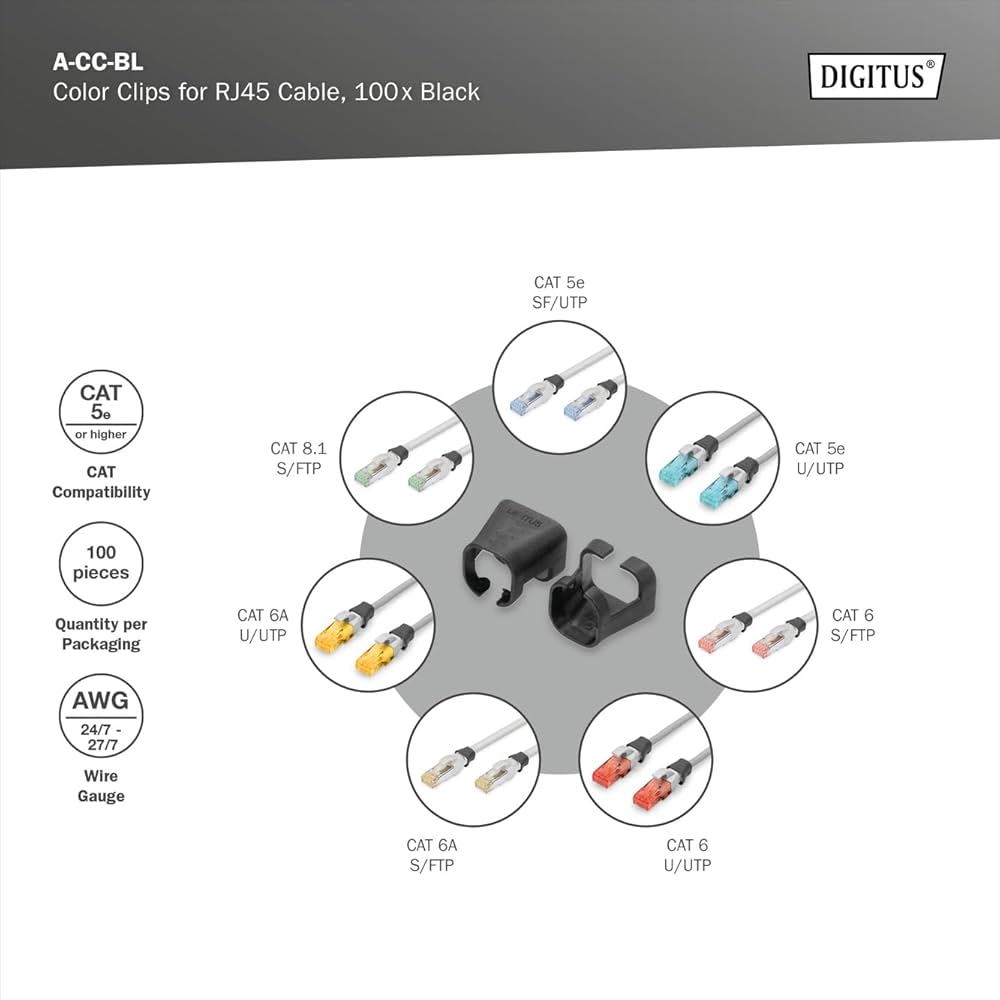 Compatibilità: Cavi patch CAT 5e - CAT 6A Materiale: PVC Porta RJ45 100 pezzi. Inoltre, il sistema standardizzato di codifica dei colori favorisce la scalabilità, consentendo la perfetta integrazione di nuovi cavi in caso di espansione delle reti. Cavo Di Rete Cat 7 DIGITUS Clip Colorate Per Cavi Patch RJ45 - Organizzazione Cromatica Dei Cavi Di Rete - 100 Pezzi - Per Cavi LAN Cat 5e, Cat 6 E Cat 6A - AWG Da 24/7 A 27/7 - Rosso Organizza Cavi Descrizione: Le clip colorate per cavi patch semplificano l'identificazione dei cavi nel networking. La rapida risoluzione dei problemi è facilitata, in quanto i tecnici possono facilmente identificare e rintracciare cavi specifici. Risoluzione rapida dei problemi: Durante la manutenzione i tecnici possono identificare e rintracciare rapidamente cavi specifici. Le migliori offerte per DIGITUS Clip Colorate per Cavi Patch RJ45 - organizzazione cromatica dei Cavi di sono su Confronta prezzi e caratteristiche di prodotti nuovi e usati Molti articoli con consegna gratis Queste clip, disponibili in vari colori, aiutano a organizzare i cavi in base alle loro funzioni o destinazioni. Ciò aumenta l'efficienza, riducendo la probabilità di errori durante l'installazione e la manutenzione. Prevenzione degli errori: le possibilità di collegare i cavi in modo errato sono ridotte al minimo e migliorano l'affidabilità e la stabilità della rete.
