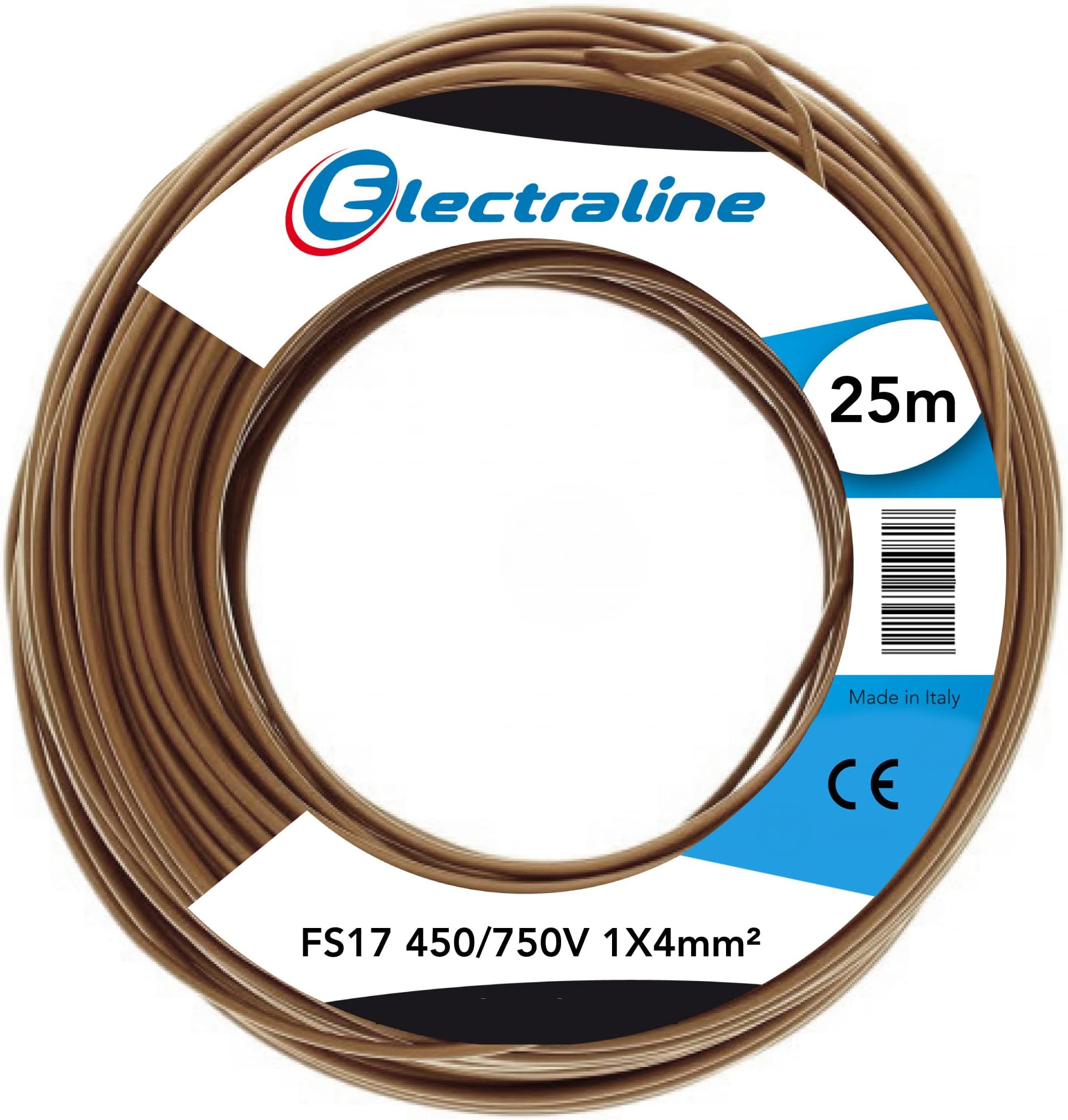 Cavo Unipolare Fs17 Electraline 13241 , 10 Mt, Sezione 1x4 Mm² Ad Cavo Elettrico Fs17 Cavo FS17, 25 metri, sezione 1 x 4 mm² con certificato DoP e conforme al regolamento CPR Per tensioni sino a 1000 V in corrente alternata o, in caso di corrente continua, sino a 750 V verso terra Electraline 13222 Cavo Unipolare FS17, 25 mt, sezione 1x4 mm² adatto per cablaggi di quadri elettrici, circuiti elettrici ascensori, montacarichi, Marrone Tensione Nominale: 450/750V - Temperatura massima di esercizio: 70° - Temperatura massima di corto circuito: 160°