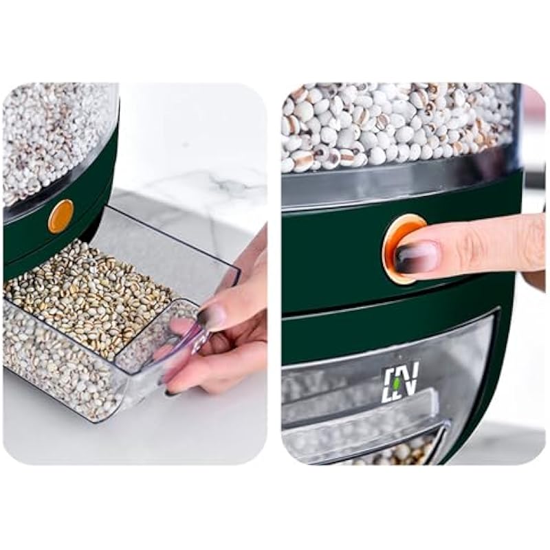 L: circa 27 x 27 x 24 cm. Dimensioni: S: circa 24 x 24 x 19 cm. Contenitore Cereali Scatola Per Cereali Secchi, Girevole A 360 Gradi, Contenitore Per Dispenser Riso Contenitore multicereali con 6 scomparti girevole a 360 gradi Dispenser per riso da cucina per cereali secchi e cereali Caratteristiche: Mantieni i tuoi cereali organizzati in modo impeccabile con il nostro contenitore multicereali, dispone di sei scomparti staccabili per la soluzione di stoccaggio dei cereali. Fatta eccezione per i cereali, questa soluzione di conservazione anche per preservare la freschezza di altri oggetti di piccole dimensioni come fagioli, lenticchie e noci, rendendolo un elemento essenziale in qualsiasi cucina organizzata. Mantieni i tuoi cereali organizzati in modo impeccabile con il nostro contenitore multicereali, dispone di sei scomparti staccabili per la soluzione di stoccaggio dei cereali. Risparmio di Spazio e Organizzato]contenitore per riso grande, Sostituisci 6 contenitori e risparmia prezioso spazio in cucina. [Applicazioni Versatili]distributore cereali da colazione, Conserva in modo sicuro e asciutto Realizzato in ABS, questo contenitore è progettato con un coperchio ermetico per prevenire la polvere e garantire che i grani rimangano asciutti. Adatto per casalinghe, appassionati di cucina che danno la priorità alla conservazione efficiente e igienica degli alimenti nelle loro routine quotidiane. Colore: bianco/verde/bianco panna. Peso: S: 1640 g. L: 2490 g.