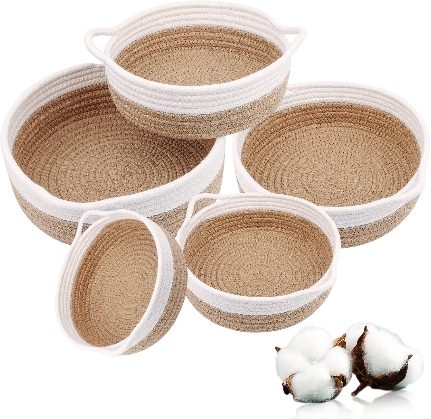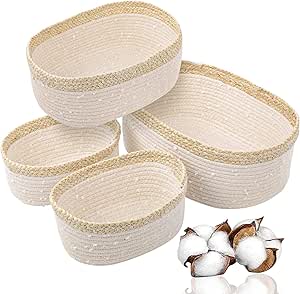 feyiubmen Set di 4 cesti portaoggetti in corda di cotone intrecciati, cesto portaoggetti impilabile per cameretta dei bambini, soggiorno, bagno, tavolo decorativo La delicatezza sulla pelle e il rispetto dell'ambiente sono al centro dell'attenzione dei cestini feyiubmen rendendoli una scelta sostenibile. Questi cestini sono lavabili, il che facilita la loro cura e ne supporta la longevità. Cestino Bagno Set Di 4 Intrecciato In Giacinto D'acqua E Cotone,cestino Portaoggetti Bagno,Impilabile Organizer Fasciatoio,Decorazione Cestini Stoccaggio Per Cameretta Salotto Ufficio Bagn Cestini Portaoggetti Un set di 4 cestini: 1 grande dimensione 32,5 x 25 x 14,5 cm, 1 dimensione media 29 x 22 x 13 cm, 2 piccole dimensioni 20,5 x 15,5 x 12,5 cm. I cestini per scaffali di feyiubmen offrono molteplici possibilità di utilizzo grazie ai materiali naturali.