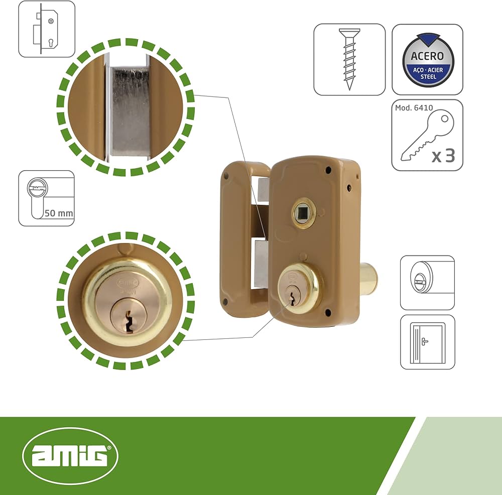 Amig - Serratura Da Sovrapposizione A Destra Con Leva Di Chiusura, Linguetta E Maniglia Per Porte In Legno Mod. 72 | 100 X 85 Mm | Chiusura Con Cilindro Rotondo | Acciaio Smaltato Oro