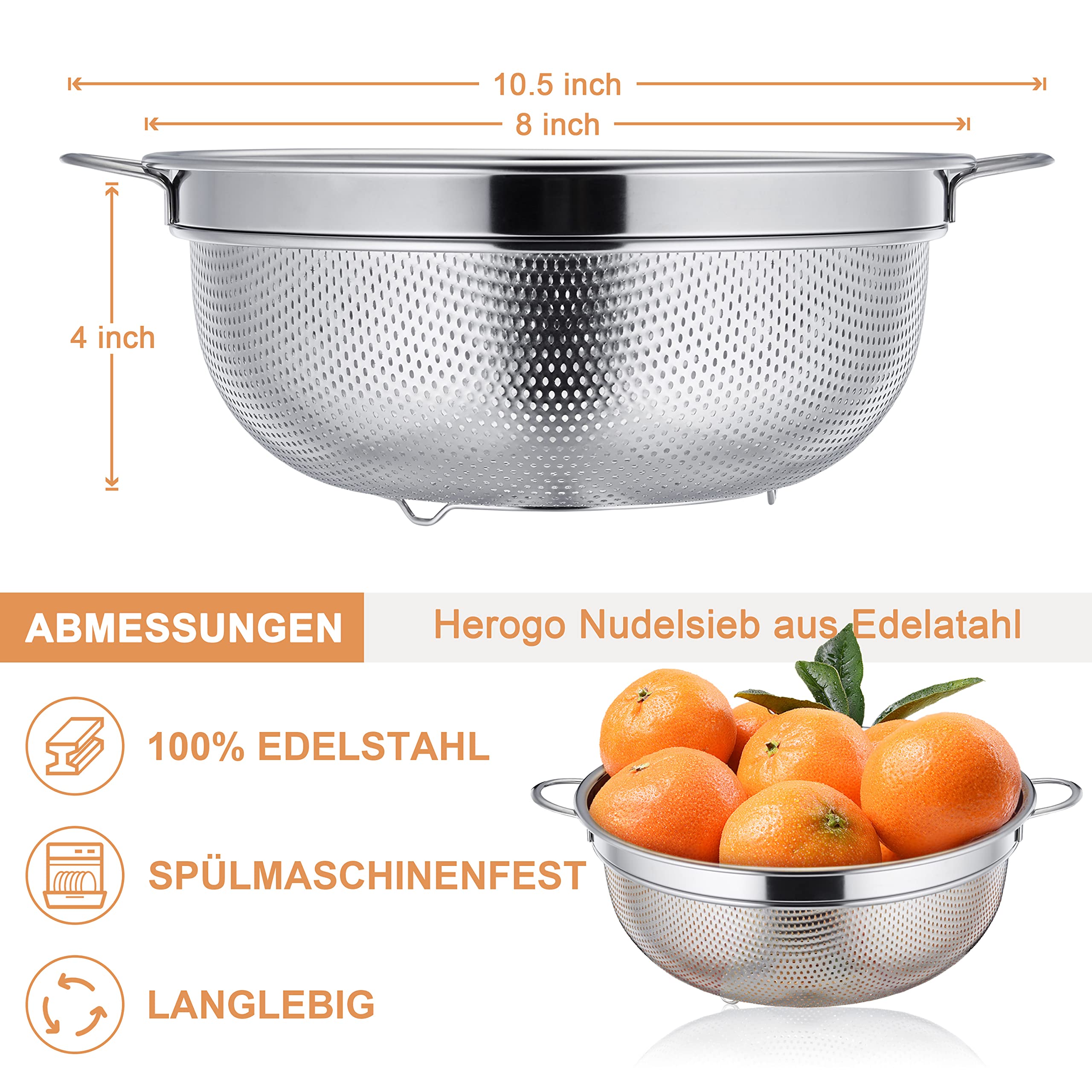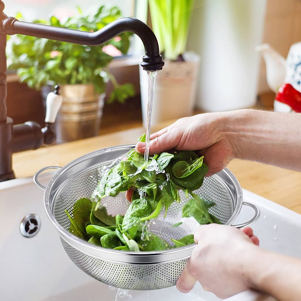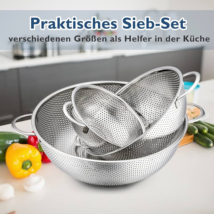 Colini In Acciaio Inox Herogo Colino Da 20 Cm, In Acciaio Inox Con Manico, Colino Da Cucina Colino Acciaio Inox Set di 3 colini da cucina Herogo, in acciaio inox, con 3 diverse misure, 16 cm/22 cm/28 cm (piccoli, medi, grandi), 3 pezzi, soddisfano tutte le vostre esigenze di cottura in cucina, ideale per scolare, scolare e pulire verdure, pasta, riso, patate, frutta e altro ancora Facile da asciugare: il colino Herogo è dotato uniformemente di piccoli fori densi che garantiscono un rapido drenaggio, in modo da poter filtrare facilmente cereali, pasta, verdure, senza preoccuparsi di residui di cibo e intasamenti Setaccio robusto e durevole, sufficiente per un uso a lungo termine Ideale per scolare, pulire e lavare tutti i tipi di alimenti. Un buon aiuto per la vostra cucina quotidiana a casa e nei ristoranti Pratico set di colini: i set di colini in tre dimensioni sono adatti per l'uso quotidiano per scolare cibi caldi e freddi. Doppio manico e base inferiore: due manici sono saldamente collegati al colino e offrono una buona presa durante il risciacquo delle verdure, pratico da appendere al ripiano della cucina o impilare, risparmiando spazio e mantiene la cucina ordinata.
