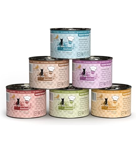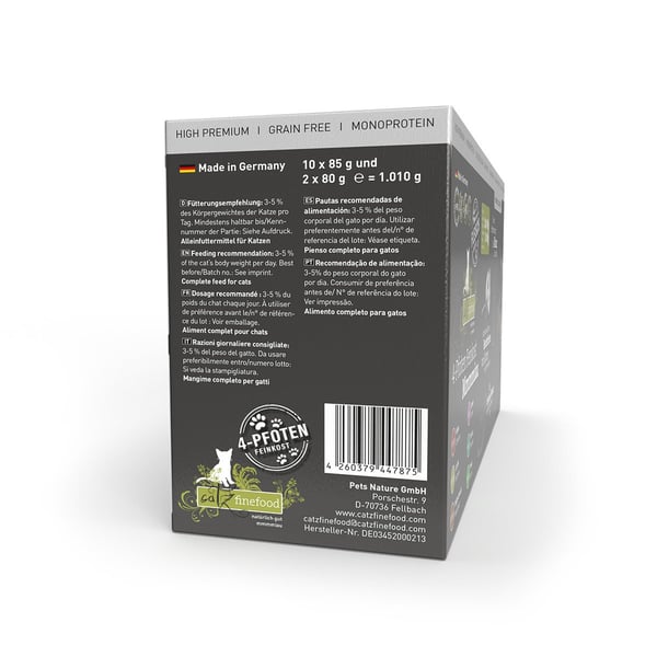 catz finefood Purrrr Collection II - Cibo monoproteico per gatti bagnato, senza cereali, senza zucchero, ipoallergenico, alto contenuto di carne, confezione multipla di cibo umido per gatti , in Prodotto in Germania: la carne proviene prevalentemente da produttori regionali, viene lavorata allo stato fresco e grazie alla delicata cottura a vapore mantiene gli ingredienti quasi completamente Per gatti sensibili: senza cereali, senza zucchero e solo un'unica fonte di proteine animali, il nostro mangime è particolarmente adatto per chi soffre di allergie e gatti sensibili, anche come alimento completo Garantito senza conservanti, esaltatori di sapidità o coloranti Questo lo rende particolarmente digeribile Umido Per Gatti Catz Finefood Purrrr Collection II - Cibo Monoproteico Per Gatti Cibo Gatti Umido INGREDIENTI: l'elenco è breve, perché oltre a carne e frattaglie, il nostro cibo umido ipoallergenico contiene solo brodo da cucina, minerali e olio di alta qualità.