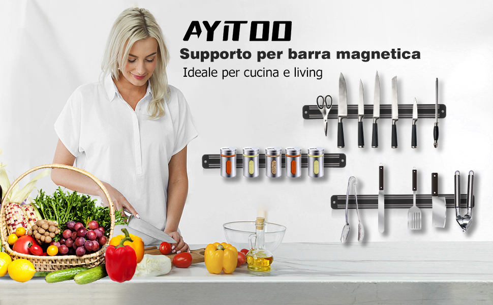 coltelli cucina barra calamita magnetica utensili magnetico supporto Il portacoltelli magnetico è un regalo ideale per uno chef o per chi ama cucinare, mantenendo i coltelli saldamente attaccati per tenere al sicuro bambini piccoli o animali. 【Materiale Affidabile】 Questo portacoltelli magnetico è realizzato in acciaio inox, robusto e durevole, anticorrosione e antiruggine, superficie liscia, facile da pulire, previene muffe e batteri, mantiene gli utensili da cucina puliti e igienici. 【Design Magnetico】 Il nostro portacoltelli è dotato di magneti incorporati che possono tenere saldamente coltelli da cucina in metallo, forbici o altre superfici magnetiche, non facili da arrugginire e facili da raggiungere. 【Multifunzionale】 Questa striscia magnetica per coltelli non solo può conservare coltelli e cucchiai, ma può anche essere utilizzata per riporre chiavi, forbici, gadget e qualsiasi altro utensile metallico più leggero nel garage, il che aiuta a risolvere il problema dello spazio e fa apparire l'intera stanza più ordinata e pulita. Barra Per Coltelli Magnetica KEEMAKE Barra Magnetica Per Coltelli 30 Cm, Porta Coltelli Magnetico In Legno Di Acacia, Calamita Coltelli Cucina Al Neodimio Da Parete : Amazon.it: Casa E Cucina Striscia Magnetica 【Risparmio di Spazio】 Con dimensioni di 19 x 4,8 x 1,3 cm, il ceppo coltelli da cucina da 3 pezzi offre spazio sufficiente per riporre gli utensili da cucina e appendere coltelli e posate in metallo, risparmiando spazio nel cassetto e facilitando l'accesso ai coltelli.