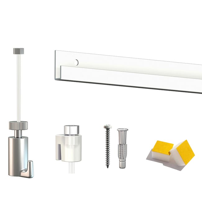 La cimasa Artiteq è una cimasa murale a scatto. Il vantaggio sta nel fatto che il fissaggio dei binari è completamente invisibile. blanc Kit Cimaise Complet Artiteq Click Rail Pour Suspension De Tableaux 2 M - Peut être Peint