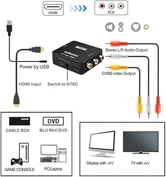 Specifiche: - Ingresso: 1 x HDMI - Uscita: 3 x RCA (giallo, bianco, rosso) - Dimensioni: 68 (L) x56 (W) x21 (H) MM - Peso: 40 g -Colore: nero - Tensione in ingresso: 5 V CC Caratteristiche: 1. Non è necessario installare driver, plug and play. 2. Uscita la sincronizzazione audio con il video. 3. Supporto per capacità di larghezza di banda elevata 1920x1080 a 60 Hz. 4. Supporta NTSC e PAL due formati TV standard di output. 5. Compatibile: HDMI 1.3. Risoluzione ingresso HDMI: -640x480 @ 60HZ, 800X600 @ 60HZ -1024x768 @ 60HZ, 1280X720 @ 60HZ -1280x1024 a 60 HZ, 1360x768 a 60 HZ -1600x1200 @ 60HZ, 1920x1080 @ 60HZ -480i / 60Hz, 480p / 60HZ, 576i / 60HZ, 576p / 60HZ -720p 50 / 60HZ, 1080i 50 / 60HZ, 1080p 50 / 60HZ -Uscita RCA: PAL, NTSC_M e NTSC_J. Si prega di collegare il cavo di alimentazione USB (incluso) all'alimentazione 5V durante l'uso. Il convertitore da HDMI a RCA converte i segnali video HDMI di alta qualità in normali segnali CVBS (AV) (definizione standard 480i, 576i) per chiavette TV / Roku, TV, VHS VCR, masterizzatori DVD, ecc. Il convertitore da HDMI a RCA converte i segnali video HDMI di alta qualità in normali segnali CVBS (AV) (definizione standard 480i, 576i) per chiavette TV / Roku, TV, VHS VCR, masterizzatori DVD, ecc. Collegati a qualsiasi TV, monitor o proiettore tramit Il convertitore HDMI2AV ha un chip IC avanzato integrato in grado di convertire i segnali digitali HDMI in segnali analogici AV. Yiany Il convertitore da Mini HDMI a 3RCA / AV può convertire segnali video / audio HDMI in segnali video compositi AV (CVB) e segnali audio stereo FL / FR per TV che supportano NTSC e PAL, videoregistratori VHS, masterizzatori DVD e altri dispositivi. Adattatore Hdmi Video Rca Aolirot Adattatore HDMI A AV, Convertitore Mini 1080P HDMI To 3AV CVBS Composito Con USB Cavo, Supporta PAL/NTSC Per TV HD, PC, Laptop, Xbox, VHS, VCR, Lettori DVD Rca To Hdmi Plug and play, senza driver portatili e flessibili. Non è un convertitore a due vie e non può trasmettere il segnale dalla sorgente AV al display HDMI. Può essere utilizzato con Amazon Fire Stick, Roku, Chromecast, Apple TV, PC, PS3, PS4, laptop , Xbox, HDTV, DVD e altra perfetta compatibilità. La sorgente HDMI non può generare abbastanza potenza, quindi è necessaria un'alimentazione esterna. La conversione HDMI-RCA richiede DAC e conversione del segnale analogico.