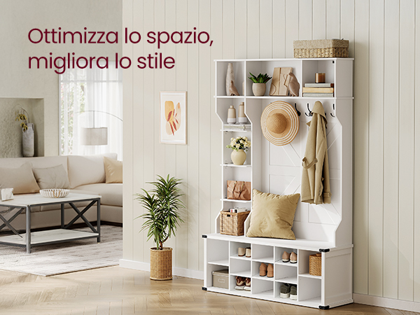 Questo appendiabiti crea uno spazio calmo e organizzato per consentire alla tua casa di respirare. DescrizioneUn appendiabiti multifunzionale ti aiuta davvero a iniziare bene una giornata intensa e impegnativa. Prodotto 3 in 1, appendiabiti , panca e scarpiera. Appendiabiti : 5 robusti ganci per organizzare cappotti, chiavi, cappelli e sciarpe a portat - Istruzioni di installazione x 1 Avviso di sicurezza Questo prodotto contiene istruzioni e avvertenze sulla sicurezza per un corretto montaggio, utilizzo e manutenzione al fine di garantire la sicurezza dell'utente. Descrizione prodotto Con una capacità di peso di 100 kg sulla panchina, questo albero da corridoio può ospitare 6-8 paia di scarpe. La confezione include: - 1 appendiabiti per scarpe. poiché forniamo hardware di montaggio e istruzioni di installazione incluse, inoltre, la superficie liscia garantisce una pulizia efficiente e veloce. Pur dando un look unico ed elegante, aggiungi uno stile retrò al tuo ingresso, fango o corridoio mantenendo la tua casa ordinata. Risparmia spazio con questa versatile soluzione di archiviazione. La scarpiera a due strati aiuta a riordinare la tua casa. Dotato di un'asta appendiabiti, ganci a doppia faccia e uno sgabello per scarpe con 2 livelli di stoccaggio, questo albero da corridoio mantiene il tuo spazio senza ingombri. Appendiabiti Con Panca Appendiabi Con Cappuccio Con 12 Ganci Hall Tree Con Panca Panca Spogliatoio Mantieni il tuo ingresso organizzato e pronto per qualsiasi uscita. Si prega di fare riferimento al manuale di istruzioni fornito.