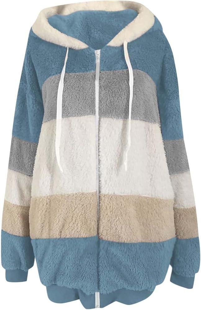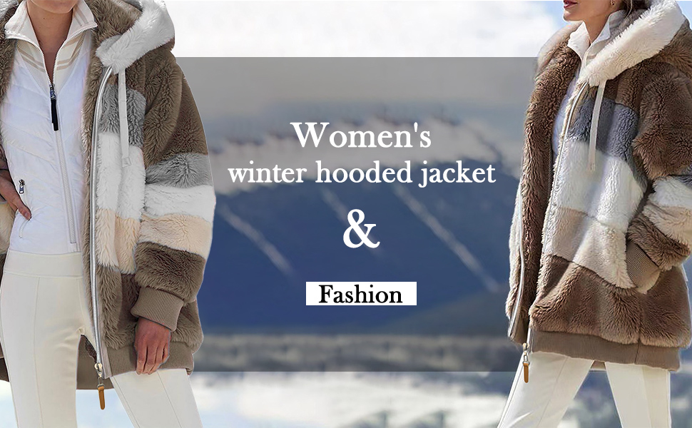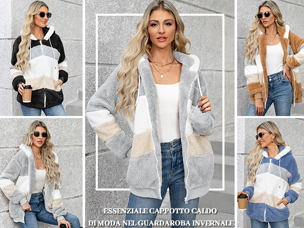 Giacca Invernale Donna Con Cappuccio, In Pile, Patchwork, Manica