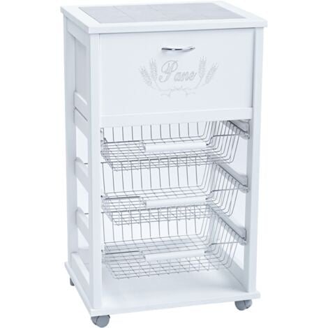 LA TUA CASA IN UN CLICK Carrello Cucina portafrutta portapane con Ruote (Laccato Bianco) ; Dimensioni del prodotto. 37P x 48l x 83H cm Prestare attenzione alle dita durante l'assemblaggio e l'uso a causa dei punti di pinza potenziali. Dimensioni: 48 x 37 x 83 cm L x P x A. Piano in piastrelle bianche per permettervi di posizionare i vostri forni, macchine da caffè ecc.... 1 cassetto pane - carrello frutta in legno massello verniciato - 3 cestelli in acciaio con manici in legno removibili - Ruote piroettanti per un facile spostamento. Usare cautela quando si sposta su superfici irregolari per evitare di rovesciare il carrello. Cucina 001410 - Carrello Cucina Portafrutta Con Cassetto Portaoggetti BIANCO Carrello Portafrutta Avviso di sicurezza Non superare la capacità di peso di 26.46 libbre.