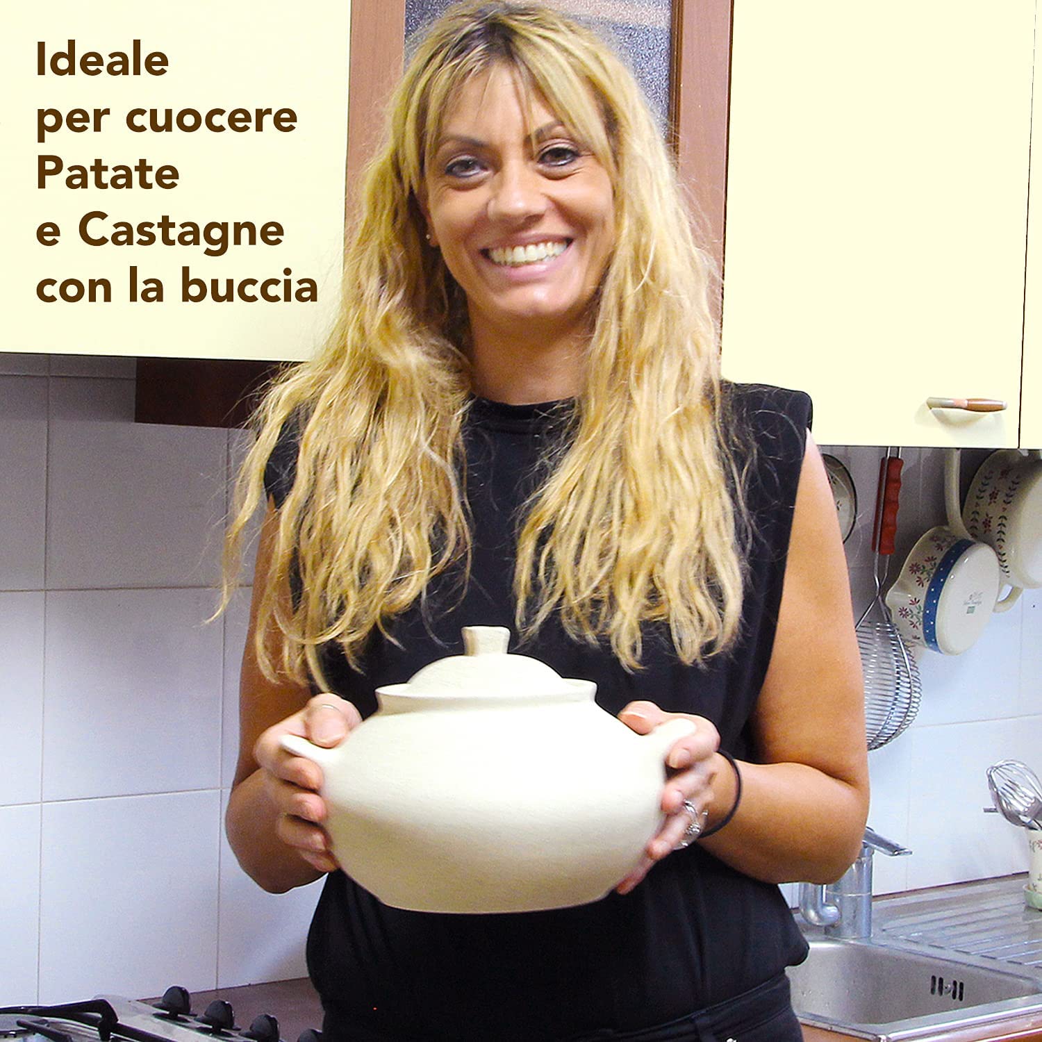 ● Non lavare mai con acqua. Packaging super imballo a prova di corriere per un regalo originale con prezzo moderato Pentola Ghisa Wald Pentola Con Coperchio In Argilla Kergrès Cubetti Ghiaccio Silicone Realizzato con una particolare argilla da fiamma , naturale e non smaltata, per una cottura esclusivamente a secco ( con totale assenza di acqua). 007-FIA-GRI Spedizione gratuita in zona e per ordini superiori a 69 ● La porzione delle patate che resta a contatto della parete della pentola si tosta più velocemente e per avere una cottura omogenea si consiglia di girarle dopo 20/25 minuti. ● Per cuocere le castagne incidere la buccia, mettere una quantità di castagne che permetta di mescolarle bene, girare di tanto in tanto fino alla cottura desiderata. Progettato per cottura solo a secco (con totale assenza di acqua), senza la retina spargifiamma Si può verificare il livello di cottura con uno stecchino o con una forchetta. Nel libricino, italiano e inglese, che troverete all'interno della confezione regalo, ve ne suggeriamo alcuni! Inoltre, scoprirete tante altre informazioni. Consigli per l’uso: ● Scegliere patate di media grandezza, pulire senza sbucciarle e posizionarle asciutte nella pentola avendo cura di non riempirla troppo e che rimanga abbastanza spazio per girare le patate durante la cottura. Con l’uso l’interno si scurisce in maniera graduale e naturale nel tempo. ● Il tempo di cottura varia secondo la grandezza delle patate o se si preferiscono più tostate o morbide, se necessario girare le patate più di una volta durante la cottura. ● Il tempo di cottura per patate medie è di circa 40/50 minuti… E potrai assaporare il tradizionale gusto di quelle cotte sotto la “brace”!