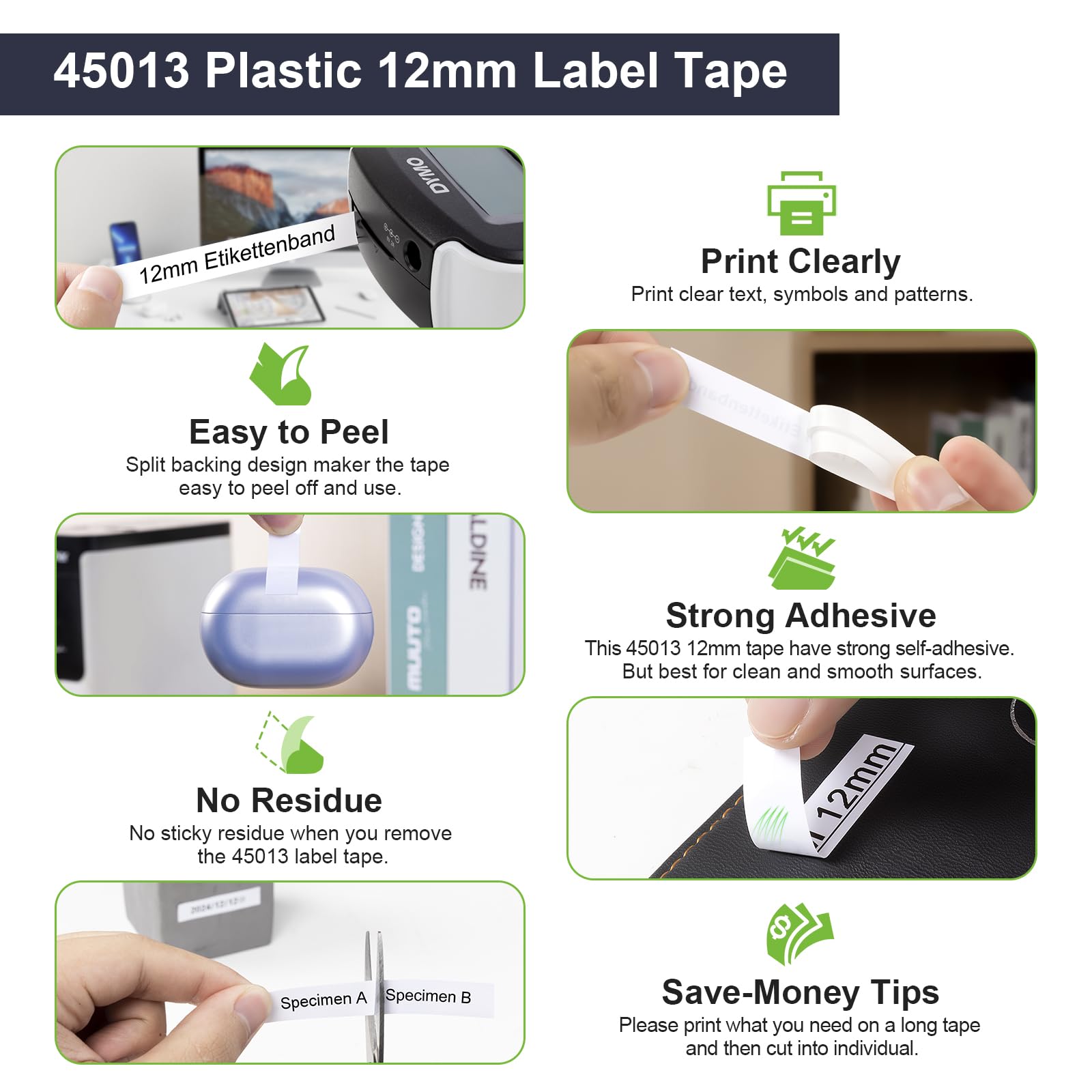 Speciaal tweedelig rugontwerp voor eenvoudig verwijderen en geen kleverige resten bij het verwijderen. Breed scala aan toepassingen Facile da installare e da usare: installato sull'adattatore Compatibile con Dymo LabelManager, l'etichetta si stampa direttamente termicamente, senza inchiostro o toner, ed è molto chiara, il che lo rende ideale per uffici, case, scuole e altri luoghi interni. Le etichette di carta compatibili con Dymo LabelManager sono compatibili con le seguenti caratteristiche: impermeabili, resistenti all'abrasione e molto adesive. Parametri del nastro di carta D1: modello: 45013 45016 45017 45018 45018 45019; colore: nero su bianco/rosso/giallo/blu/verde; confezione: 6 nastri di plastica; dimensioni: 12mm x 7m Ampia gamma di applicazioni: le etichette di carta Compatibile con Dymo consentono di codificare i colori dei cassetti e dei barattoli delle spezie ed etichettare gli articoli organizzati. Dymo Etichette 6 X Molabel Compatibili Con Dymo D1 Nastro 19 Mm X 7 M 45803 S0720830 Nero Su Bianco, Adatto Per Dymo LabelManager 350, 360D, 420P, 450, 500TS E LabelPoint 300, 350 Etichette Dymo Speciale design del retro in due parti per un facile distacco e assenza di residui appiccicosi durante la rimozione.