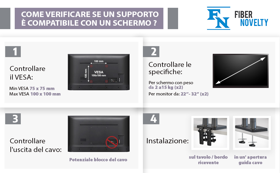 Regolazione dell’inclinazione: +85°/-30° Funzione di rotazione a 360 gradi, inclinazione, rotazione, guida cavo espandibile integrata. Regolazione dell’altezza dello schermo da 200 mm ~ 520 mm Istruzioni per il montaggio Gli schermi possono essere ruotati di 360 ° e inclinati senza sforzo +85/-30° . Sistema PIVOT che permette di ruotare lo schermo di 360° Porta USB nella base del supporto Il supporto garantisce il corretto funzionamento degli schermi con peso da 2 a 15 kg (x2) Possibilità di orientare, inclinare e ruotare lo schermo Sistema di cavi nascosti che consente di passare i cavi all’interno del braccio e migliorare l’estetica Sistema di montaggio VESA Compatibile con VESA:VESA 75×75 VESA 100×100 CON MOBILITÀ COMPLETA: Il tuoi monitor sono supportati da molla a gas per una distribuzione ideale del peso e possono essere spostati a proprio piacimento. Gli schermi possono essere ruotati di 360 ° e inclinati senza sforzo +85/-30° . Centinaia di prodot Realizzato in robusta lega di alluminio Colore grigio Garanzia 2 anni Supporto Tv Parete Supporto TV Da Parete Con Molla A Gas Per Schermi 13 - 32 Fino A 8 K – ONKRON IT Supporto Pc Portatile Porta USB nella base COMPATIBILITÀ: Compatibile con 2 monitore con una diagonale da 22 - 32 pollici, con peso da 2 a 15 kg, compatibile con lo standard di montaggio VESA: 75x75 mm e 100x100 mm. Descrizione Prodotto G35 Solido supporto da scrivania con molla a gas per doppio monitor LCD e LED da 22″ - 32″ con peso da 2 a 15 kg molto semplice regolazione orizzontale in formato verticale (funzione pivot).