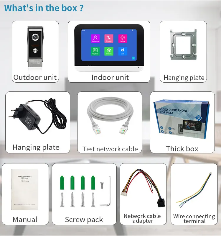 Campanello da esterno: Risoluzione orizzontale: 2MP 1080P Sensore di immagine: sensore CMOS colorato Dimensione del sensore: 1/3, angolo visivo: 160 gradi Visione notturna: Taglio IR Nessuna deviazione di colore, visione notturna B/N Materiale del pannello: Lega di alluminio/ABS Installazione: Montaggio in superficie Semplice connessione a 4 fili Dimensioni: 145x45x30 mm Monitor tattile per interni: Schermo: 7 pollici TFT-LCD touch screen Risoluzione: 1024 x 680 Anello: anelli con melodia a 7 accordi Volume, colore: regolabile Modo di connessione: 4 fili, soluzione WIFI tuya Materiale del pannello: Copertura acrilica/ABS Installazione: Montaggio in superficie Tensione di ingresso: AC 100-240V 50/60Hz Tensione di lavoro: DC 12V, 2A Dimensioni: 190x130x21 mm Acerca de la conexión Wifi: Tenga en cuenta que el sistema de video portero wifi no significa que no necesite ningún cable. REAL-TIME MONITORING, DON'T MISS ANY VISITOR: With the latest IP technology, when a visitor presses the doorbell, your mobile phone will receive a call from the TUYA APP, you can see, hear and talk to the person outside the door, you can even unlock the door remotely from anywhere with your smartphone, don't miss any delivery or keep your guests waiting. You can view the footage on your smartphone at any time. 140o grandangolo con copertura antipioggia, altoparlante e microfono integrati. Compra Sistema di videocitofono dell'appartamento cablato, 4 unità 7 pollici Touch Monitor, 3 in 1 sblocco, Dual Way Intercom Tuya per la casa Vally (bianco) a prezzi vantaggiosi su . Spedizione Gratuita disponibile per membri Prime su oltre un m El monitor es compatible con la red WIFI, pero el monitor interior y el timbre se conectan por cable. Può essere utilizzata in appartamenti, ville, hotel, uffici, edifici pubblici. Monitor Touch Nuovo Sistema Di Citofono Per Videocitofono Intelligente Tuya Wifi Da 7 Pollici Con Monitor E Serratura Con Sblocco Dell'app Del Telefono Della Fotocamera Del Campanello RFID - AliExpress Cardo Interfono Supporta lo sblocco a distanza, il monitoraggio, la comunicazione bidirezionale, la registrazione video, ecc. Supporta il videocitofono per un massimo di 12 dispositivi di monitoraggio della sicurezza. Ver, oír y hablar con la gente (como mensajero) como si estuviera en casa, nunca se pierda ningún visitante. 1080P HD IR visione notturna, telecamera di sorveglianza ad alta risoluzione per il controllo degli accessi, facile da installare, connessione cablata stabile, adatta per la sicurezza domestica. Monitor individuali senza interferenze. El monitor de interior y el timbre funcionan de forma estable. Very convenient and flexible.