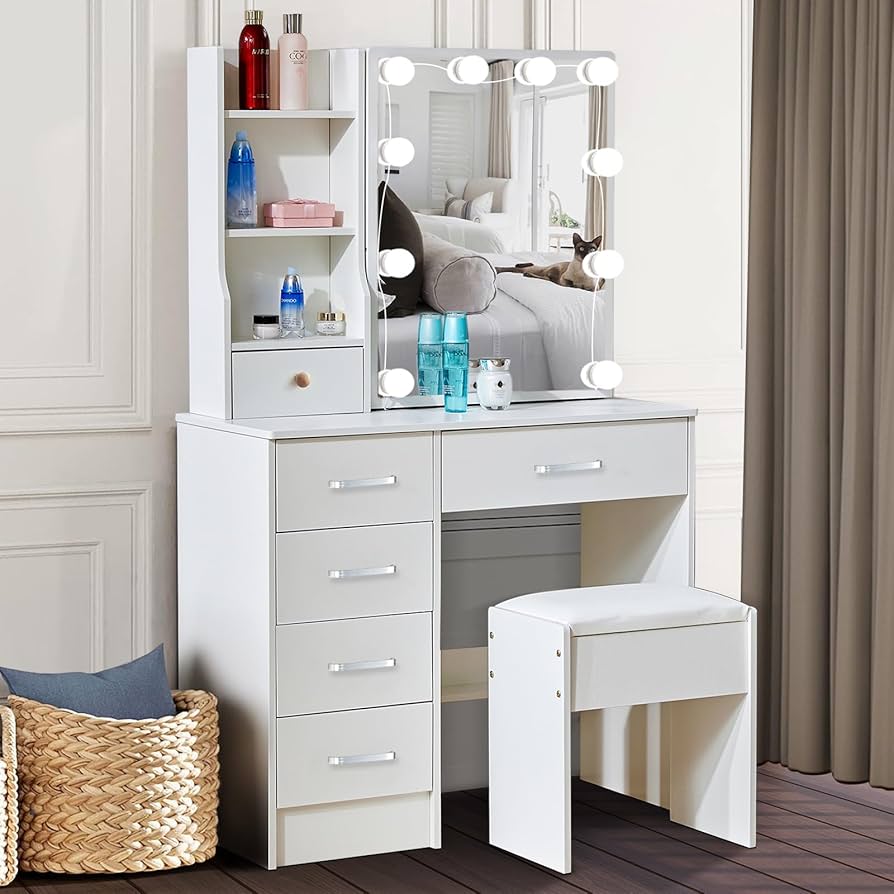 Postazione Trucco Tavolo Da Toeletta Con Specchio Illuminato A LED, Tavolo Da Trucco Con Sgabello Imbottito, Moderna Toeletta Trucco Con Specchio Il suo design spazioso è ideale per organizzare gli articoli per la bellezza, mentre resiste alla deformazione in condizioni umide Toeletta Trucco con 11 Luci LED, 3 Colori e Luminosità Regolabile, Tavolo da Trucco con Grande Specchio, Toilette da Trucco con 5 Cassetti, 80x36x131cm, Bianco La luminosità è regolabile, offrendo un’esperienza di illuminazione versatile per le tue esigenze di trucco 【Montaggio Facile】Ogni componente del tavolo da toeletta è dotato di etichette ed è accompagnato da istruzioni dettagliate per il montaggio e tutorial video, garantendo che tu possa completare facilmente l'assemblaggio Set squisito di tavolo da toeletta! Inoltre, permettendoti di esporre i tuoi oggetti proteggendo efficacemente la tua privacy 【Ampio spazio di archiviazione】Il tavolo da toeletta con specchio è dotato di 5 cassetti.