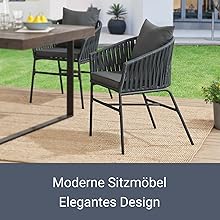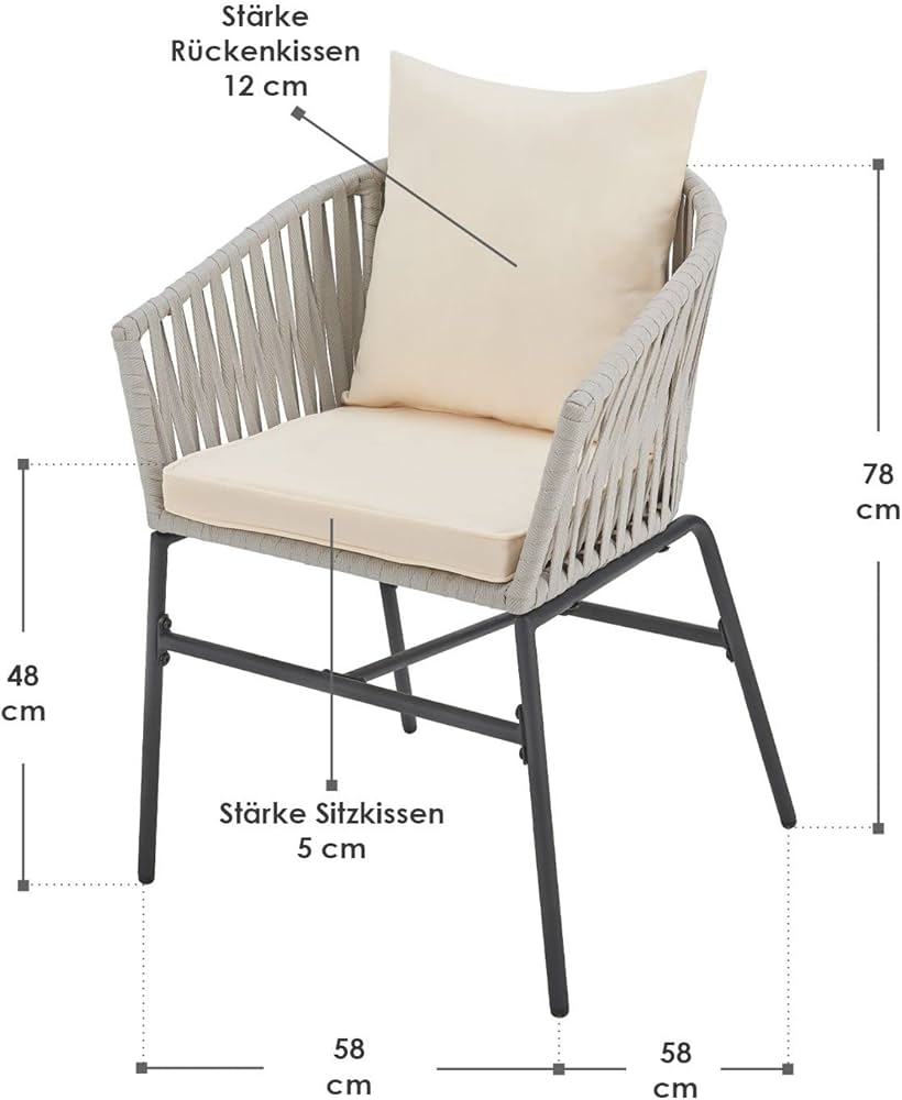 Inoltre, sono completamente rimovibili e lavabili, per garantire sempre la massima pulizia e igiene, anche dopo un uso prolungato all’esterno. La loro imbottitura di alta qualità assicura una seduta confortevole, perfetta per lunghe cene o momenti di relax in compagnia. Divanetto Da Esterno Set Di Sedie Da Giardino Con Struttura In Ferro Zincato, Cuscini Set Da Giardino Esterno DESIGN ELEGANTE E MODERNO: Rinnova i tuoi spazi con queste sedie dal raffinato design a corda intrecciata. ROBUSTEZZA E STABILITÀ: La struttura in acciaio verniciato a polveri di questo set sedie garantisce un’eccezionale durata e resistenza agli agenti atmosferici. Grazie ai materiali di qualità e al design moderno, si adattano perfettamente sia agli spazi interni che agli esterni, garantendo sempre eleganza e comfort. Il design a corda intrecciata su braccioli e schienale in pezzo unico conferisce alle sedie un carattere davvero particolare, mentre le spesse imbottiture dei cuscini per le sedute e gli schienali garantiscono un comfort di prima classe Perfette per interni ed esterni, aggiungono un tocco di stile al tuo giardino, terrazza o sala da pranzo. L’abbinamento tra l’intreccio sofisticato e la solida struttura in acciaio le rende ideali per ogni ambiente. Questo set sedie di tectake è la soluzione ideale per il tuo arredo casa o per il tuo arredo giardino esterno.