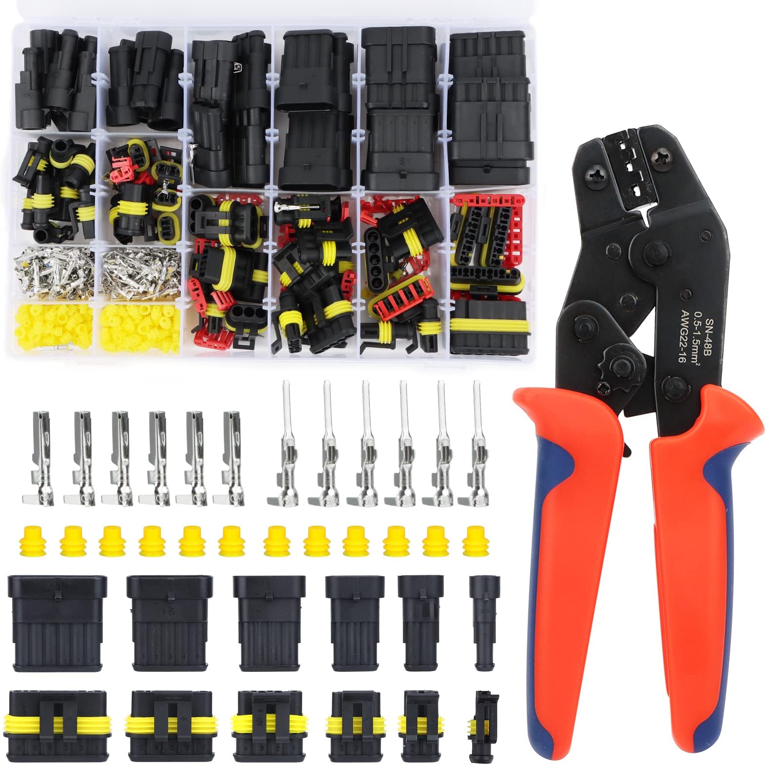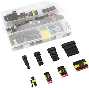 740 Pz Kit Connettore Elettrico Impermeabile, Terminale Elettrico Connettore Rapido, Spina Filo, Con Strumento di Crimpatura, per Auto, Camion, Moto (1/2/3/4/5/6 Pin Il design della coppola assicura l'inserimento accurato e completo del contatto nell'alloggiamento e impedisce che scivoli fuori dal connettore. Alta qualità 1 pin connettori impermeabile montaggio ; terminali kit 1.5mm termorestringente, materiale in nylon PA66 per l'alloggiamento. Connettore Stagno Maschio Femmina 1 via Fibbia rinforzata con elevata durezza, buona tenacità. YZZAOO 352 Pezzi Connettori Elettrici Impermeabili, Connettori Per Cavi Applicato con la guarnizione in gomma di buona qualità per rendere i kit meglio resistenti alla polvere e all'acqua.